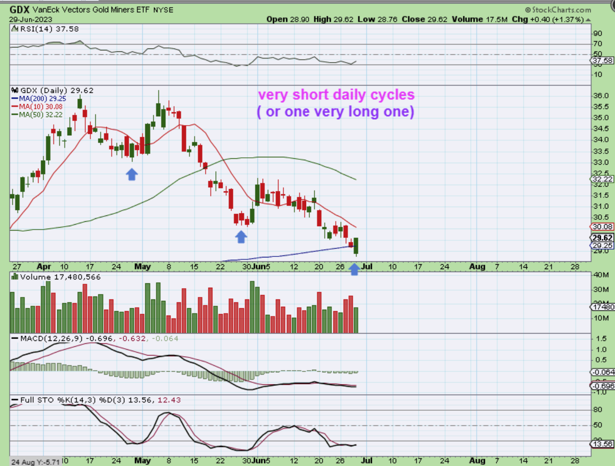 GDX is at the lowest point of this daily cycle as it lost and regained the 200sma. GDX closed up 1.37% with the USD rising. A reversal like this can be bought with a tight stop, but I do have 1 problem with the set up, and that is cycle count…