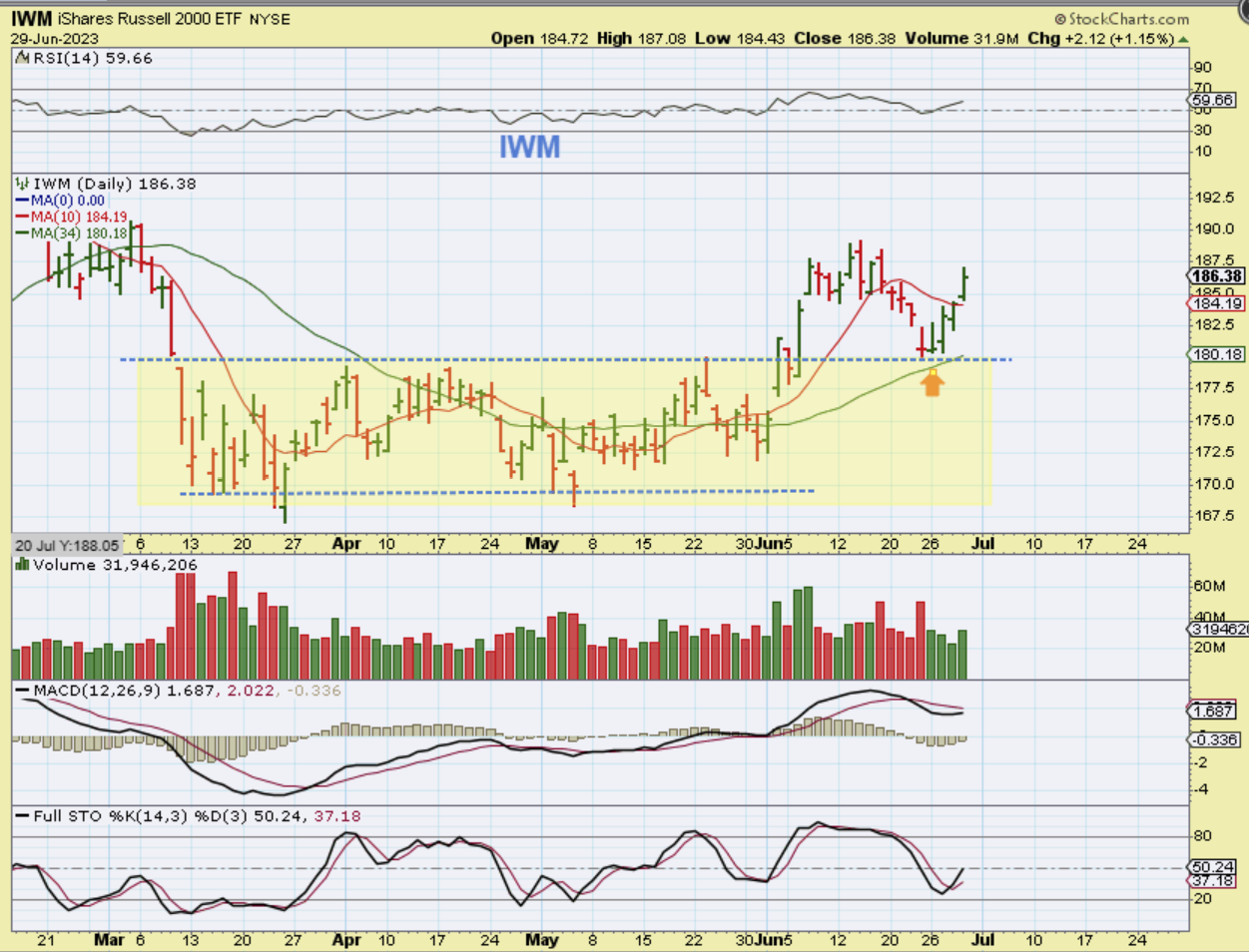 The IWM is even more clear, since it does appear to be on day 4 after reversing above the 34 sma.