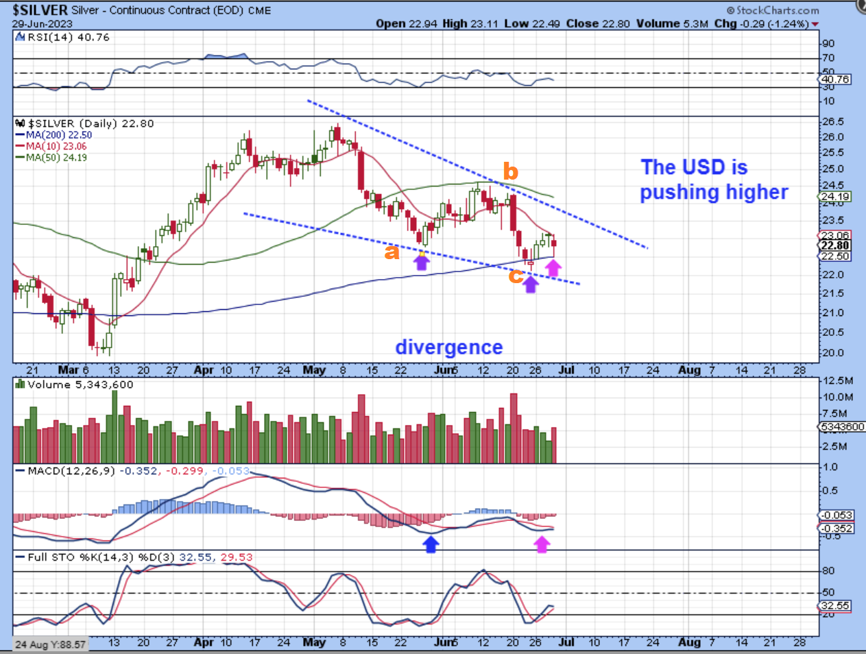 SILVER close up: Silver dropped and put in a reversal candle between the 200sma and 10sma. We have obvious divergence on the Silver May & June lows (see the MACD). This is a bullish set up, and could be an a-b-c down into an ICL. Right now we just aren’t 100% sure if it is long term bullish or a short-term bounce, but I would say that it can be bought with a stop.