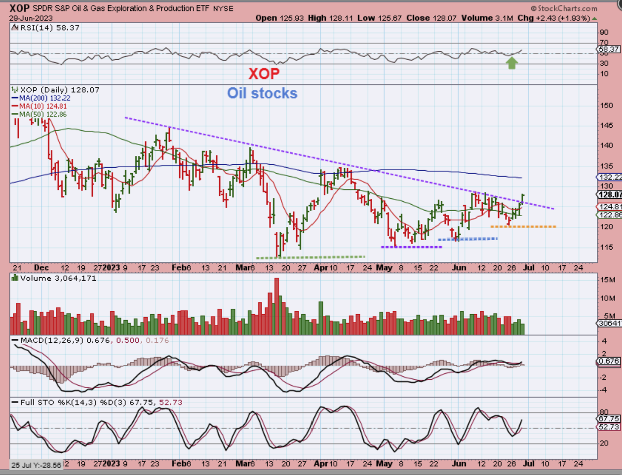 XOP: Oil is still choppy, but Oil stocks started to break above the down trend on Thursday. I also mentioned this week that the series of higher lows made oil Stocks more bullish than Oil, but it still may run to the 200sma and drop and remain choppy. Charts of NOG, APA, CPE, MRO, VLO, WTI, etc are also looking like they may push higher out of recent bases or consolidations, but it may be choppy and frustrating, unless they are short term trades. Most of those look like they could run up to their 50sma too, except for NOG. Nog has actually been riding the 50sma higher.