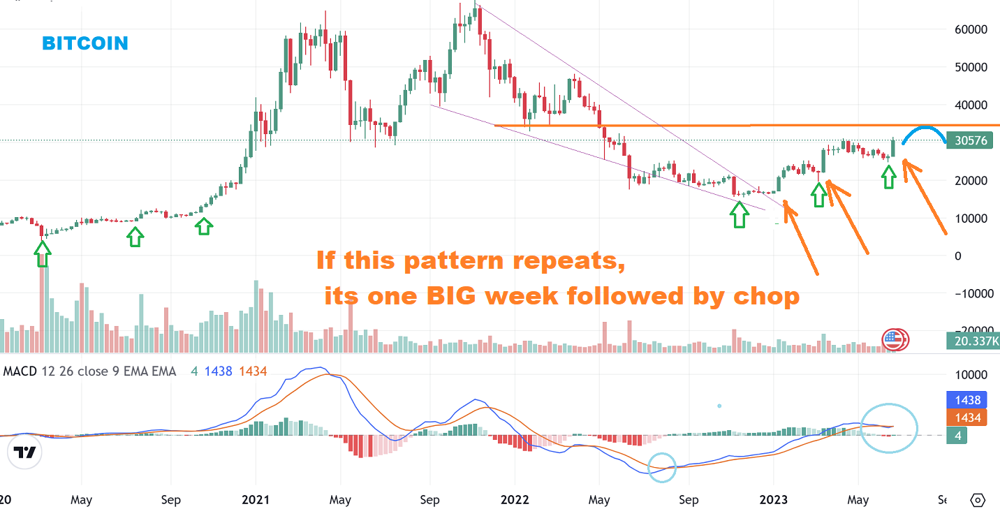 BITCOIN WEEKLY– With the current set up, this is week 2 out of the latest low and it was a big week. I expected maybe $35,000-ish recently, but since we are so early out of these cycles lows, Bitcoin could just take off & run for a few weeks too. Now even though this can just blast off like past rallies years ago (see the 3rd arrow in 2020 where it blasted higher), I want to point out something that keeps things a bit more tame for now, so let me show you a ‘tame’ idea of how this may play out too.