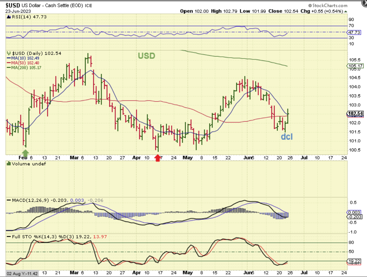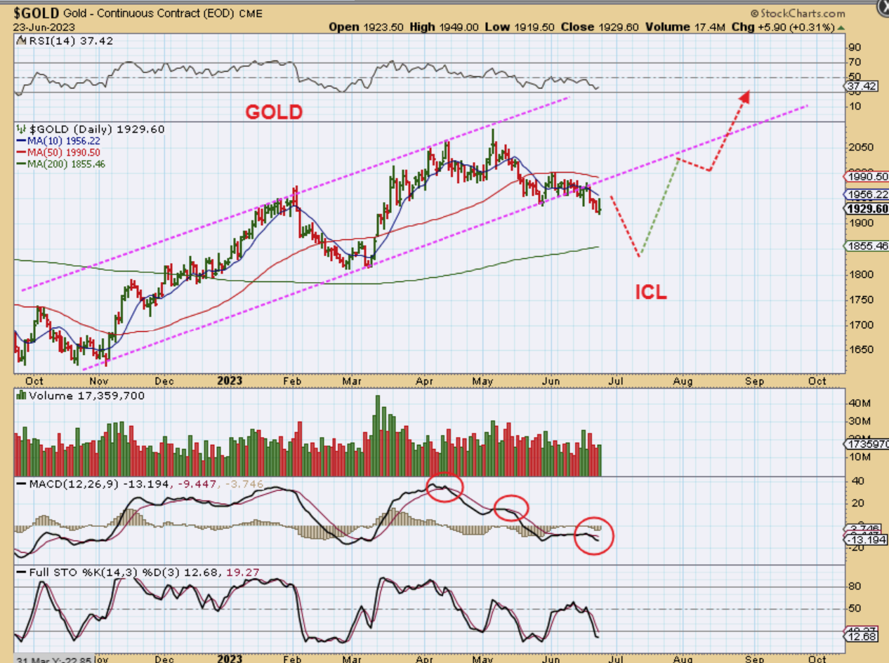 Gold Daily: Do you remember the big 2 day pop in the USD? Well the daily Gold chart shows no major reaction and Gold even closed up on Friday, so that is encouraging. I am still expecting a dip into a final low to come in though, possibly in July now.
