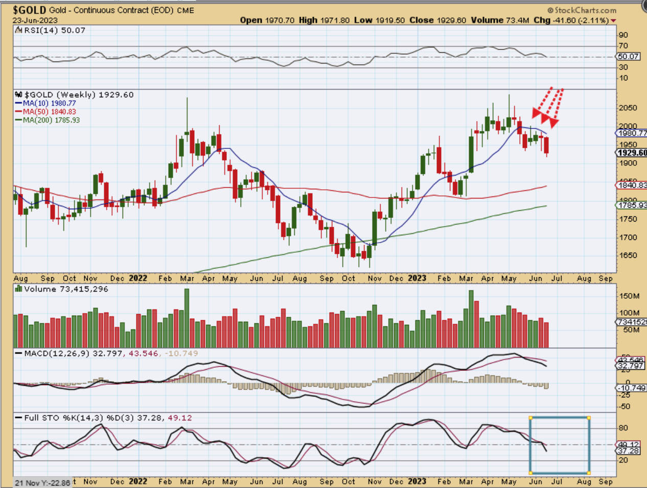 GOLD WEEKLY -Gold has been trapped under the 10 week ma, which is similar to the 50sma on a daily. The weekly stochastics also looks like it needs to sell down a bit further.