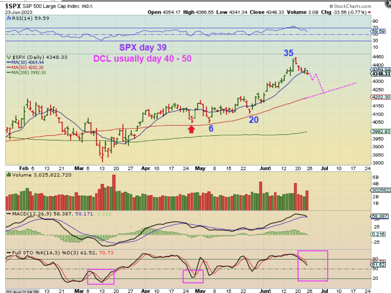 SPX DAILY – We usually start to look for or expect a dcl around day 40 or so, but lately we’ve had a couple of daily cycles that ran to 50 days long. We are on day 39 and the markets do look to be getting heavy, plus we closed under the 10 sma on Friday for the first time in a while, so I am expecting a drop and then we look for a swing low to go long as a dcl. A few days ago I mentioned that you can short this, but it is not easy to short a bull, since it is often choppy intraday. That reversal on Thursday was also pretty bullish looking and may have caused some to close shorts.