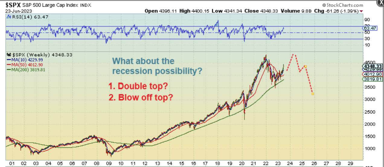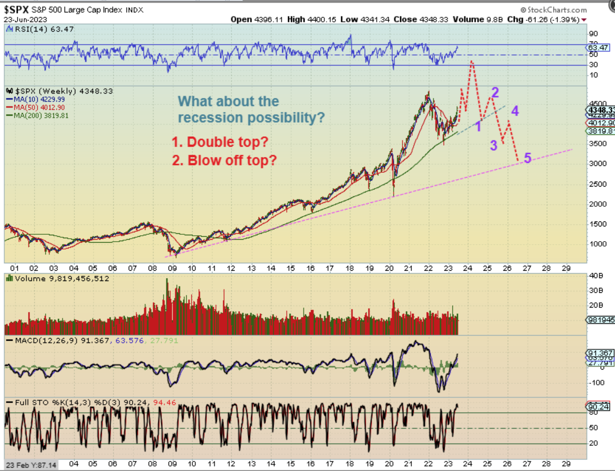 THE BIGGER PICTURE FOR THE SPX WEEKLY: With the reversal at the lows and a base, I have often mentioned that I am expecting a run back to the highs in 2023, but I also think that we’ll see signs of a recession by then, so how could that happen?
