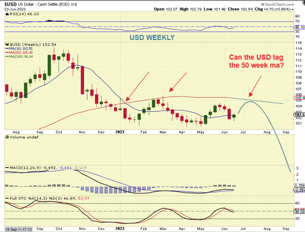 USD WEEKLY – If it remains strong, we do expect a drop with Gold and a pop with the USD, so we may see this.