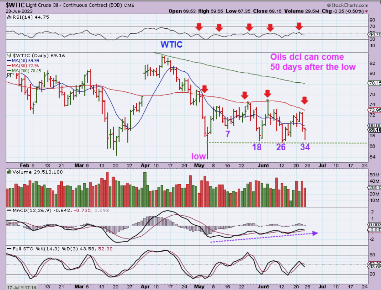 WTIC DAILY – Oil has been so choppy that it has become predictable 🙂 . Oil often runs 45-50 days from dcl to dcl, so on day 34, we have more of this to go if it can’t break that 50sma (now curling down again).