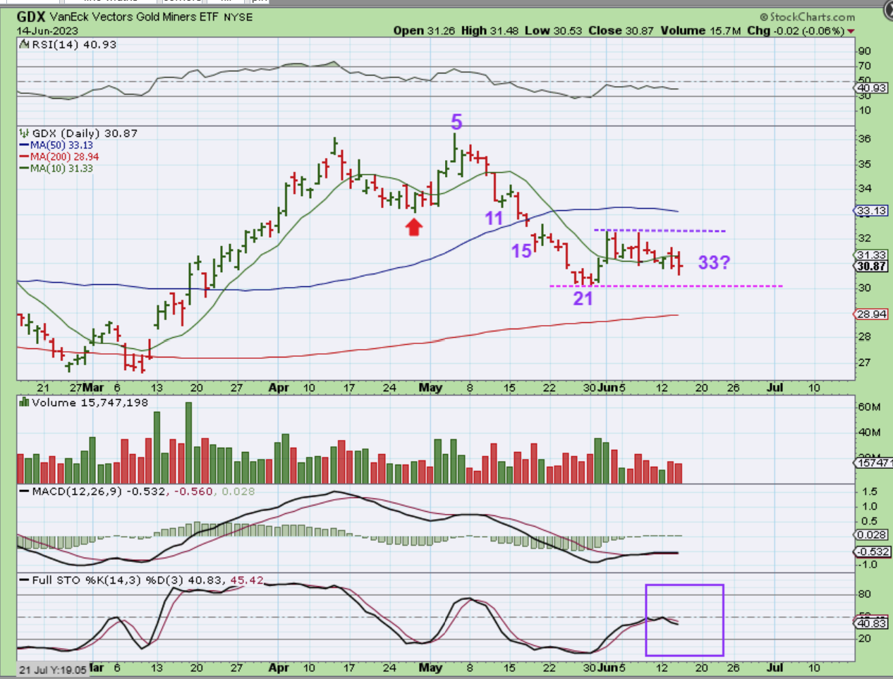 At this point, I have had some buy and hold positions in the reports of the past couple of weeks with Biotech, Tech, and even shorter-term trades in EV / Clean Energy with the IWM breaking out. That said, if we are expecting some selling into a dcl soon, some may want to raise stops or take profits ( I sold 1/2 of my position size heading into the Fed just to be safe). EV and Clean Energy seems to have joined in on the bullishness lately, but right now starting new positions may have added risk of choppiness. Most of what we are looking at would be to get ready for a buy the dip play (unless some wanted to try to go short once the selling starts in the general markets or use JDST/DUST when Miners sell down). I will say that it is very difficult to short a bull market, because buyers often continue to step in and cause bounces, or reactions to good news can also cause a solid bounce along the way, but that choice is each ones to make. We have SOXS, SQQQ, SPXS, JDST, DUST as leveraged short possibilities, once the selling starts. Those may offer 1 day ‘day trades/ scalps’ or a couple of days of gains. For now, I am trying to mentally prepare for a dip in all sectors, and if Gold & Silver decide to break out above the 50sma, that would signal a bullish run back to the highs for a possible break out, so we’ll keep that in mind too.