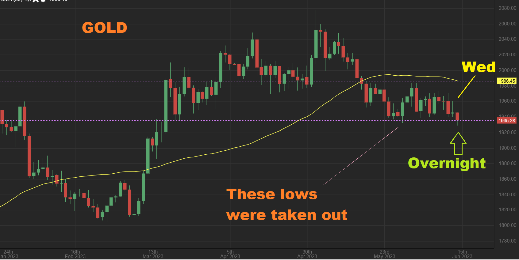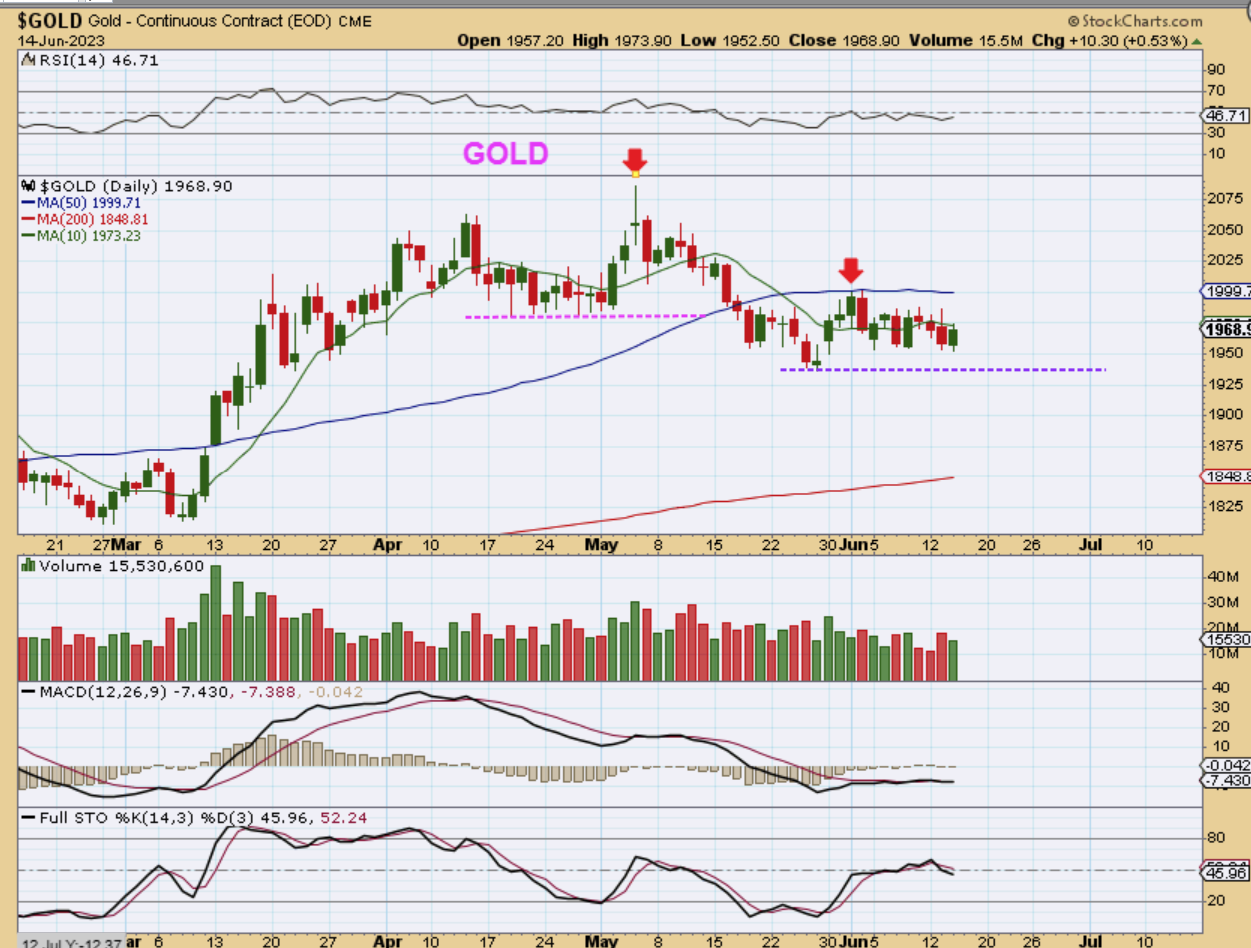 I see GOLD green here, but I believe that this is reflecting the Gold price as of 1 p.m., since it really closed as a bounce to the 10sma and a drop. Let me show you spot Gold for Wednesday and the live shot at 6 a.m. ET…