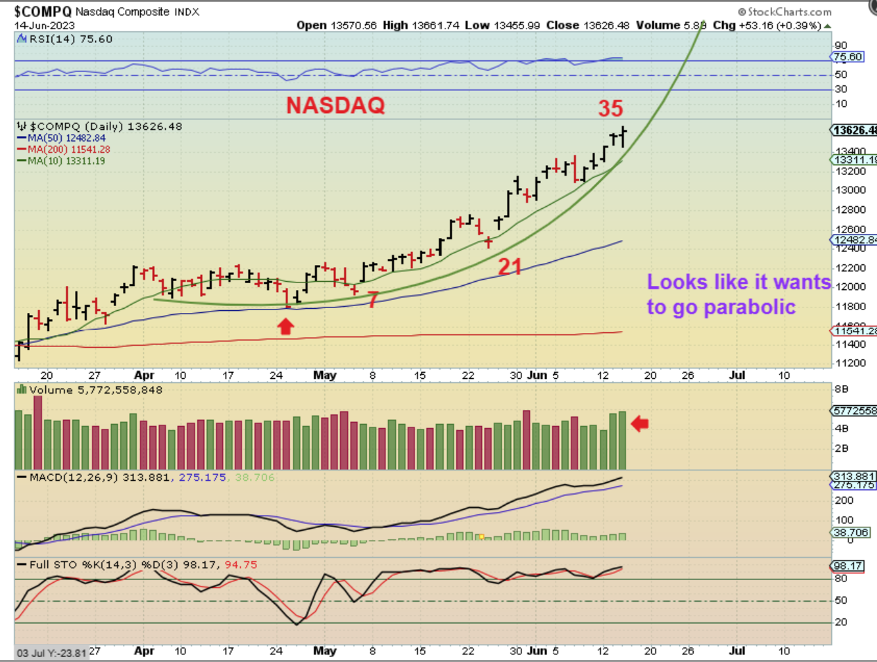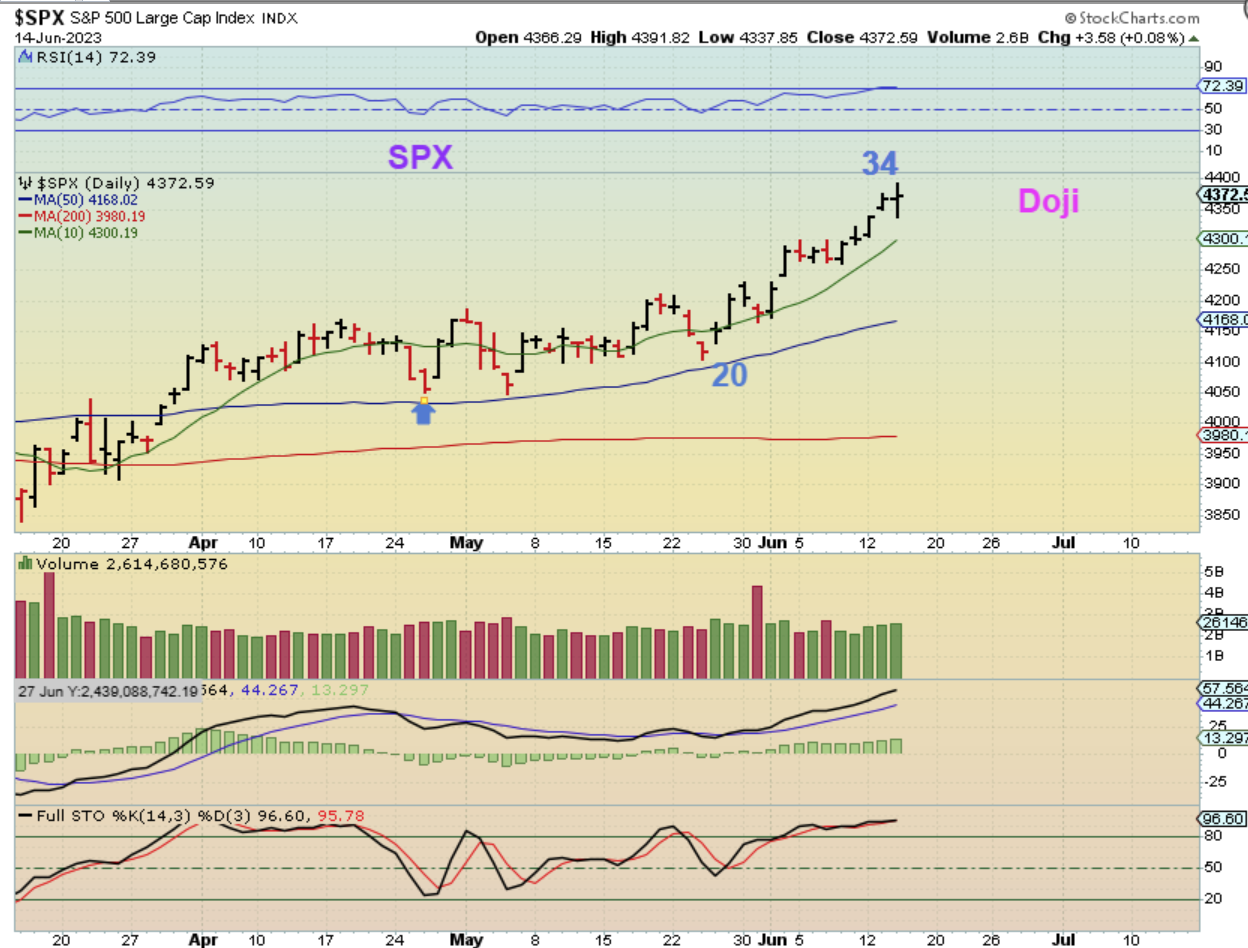 So far we’ve had the CPI, the PPI, and the Fed Rate Pause, with no immediate damage to the markets. Let’s do a quick review, but before we do I just want to remind everyone that we have jobless claims today at 8:30 am ET and Quad Witching Friday. Along with that is the idea that this daily cycle in the General Markets is Very Bullish, but also it is due for a drop into a dcl at any time. So with all of that in mind, lets review the charts…
