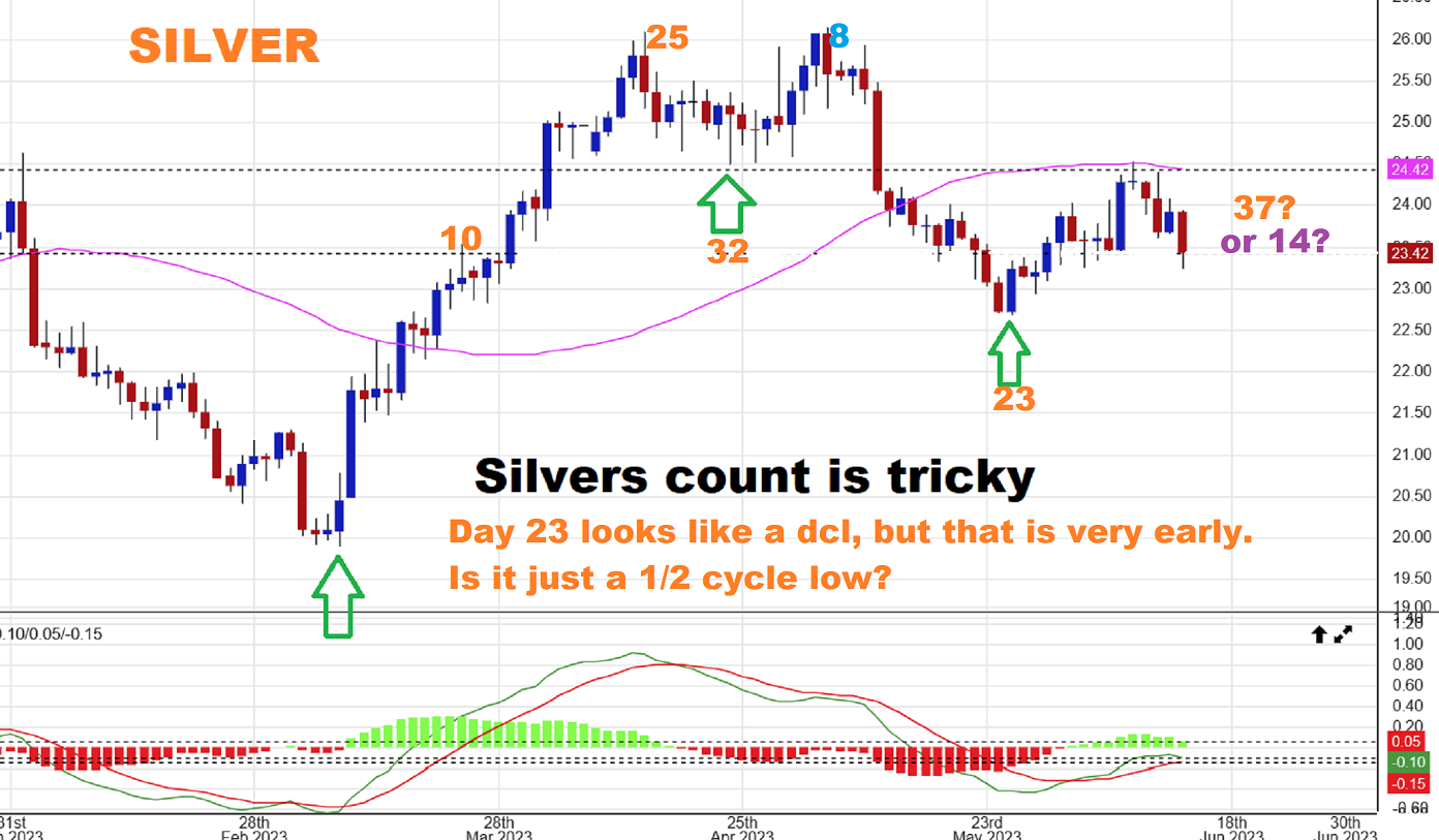SILVER is tricky and this is why: We had a normal day 32 dcl in April. Then a drop to day 23. Was that an early day 23 dcl? Or was that a 1/2 cycle low and we are now on day 37? Either way, this is an odd set up, because a dcl is due on day 37 , but it should break the day 23 lows. Again, is this really day 14 with a day 23 dcl and could sell off for another 20 days or so, into the next dcl? The set up is odd if you’re trying to use cycle counts.