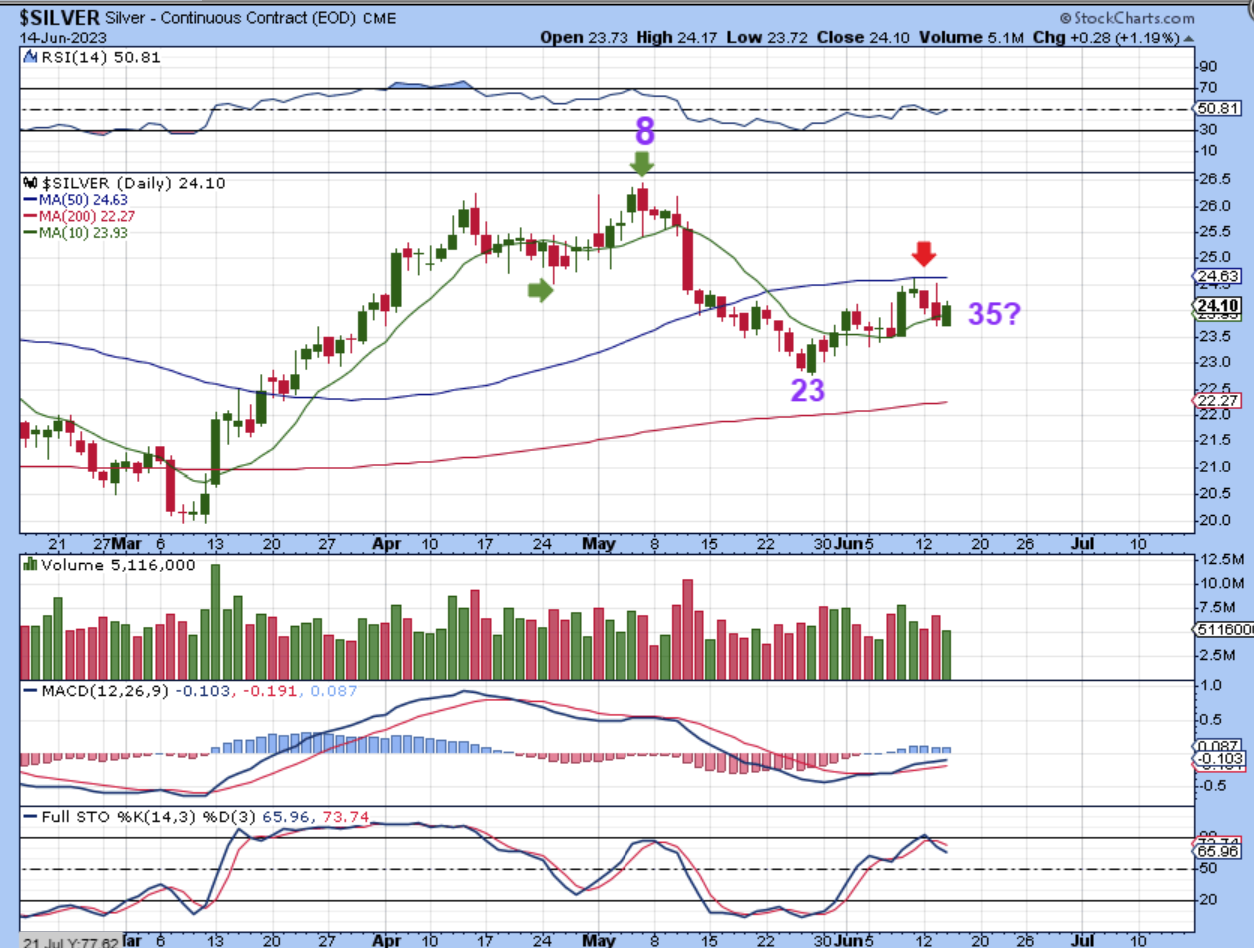 SILVER was stopped at the 50sma and dropped lower too. Lets look at Silver live, since it did not break the recent lows…