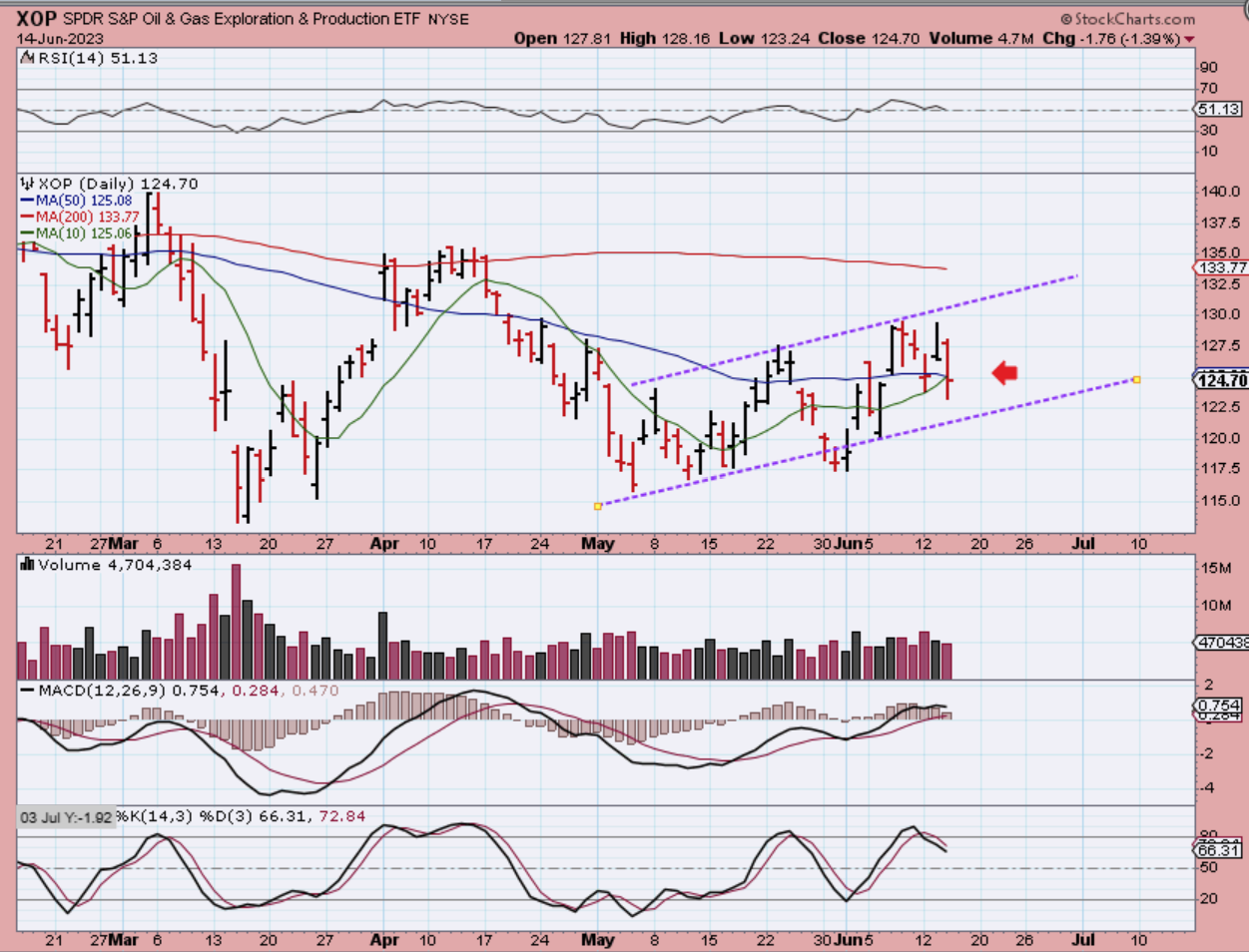 XOP – Oil stocks were holding up around the 50sma, but I drew this channel recently and mentioned that a trip to the lows was possible if Oil remains choppy. That looks even more likely now, so Oil stocks are not as weak, but they are still choppy too.
