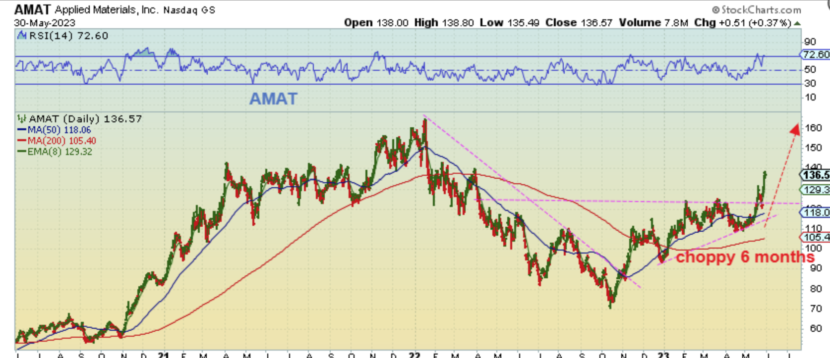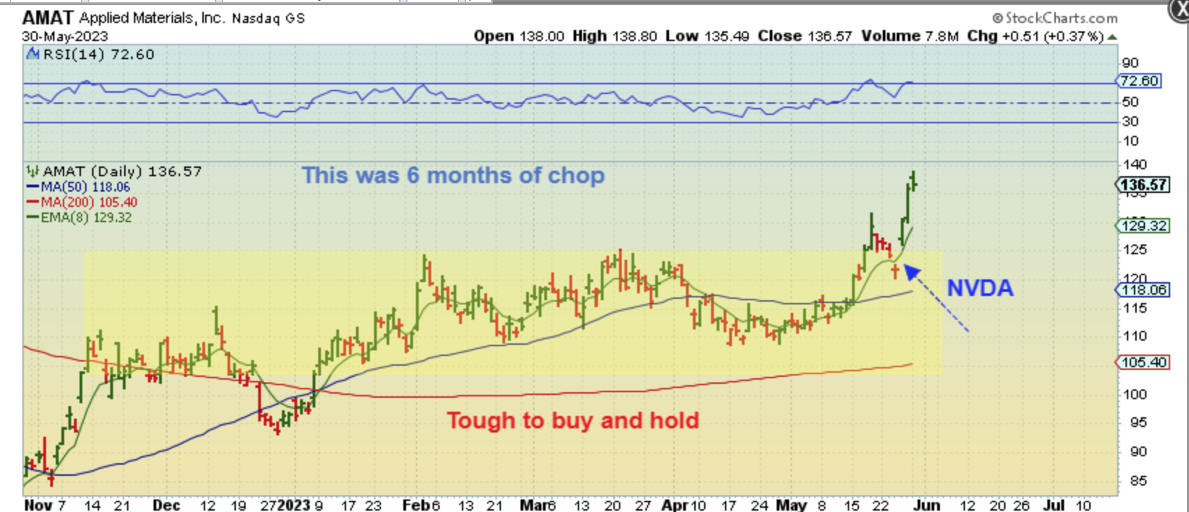 AMAT – If I had you buy AMAT in January, it was choppy and break even for months, right? Buying in November would give you a $110 price and it chopped around $110 all through 2023, but that NVDA earnings beat ‘trigger’ is causing a breakout from that consolidation and…
