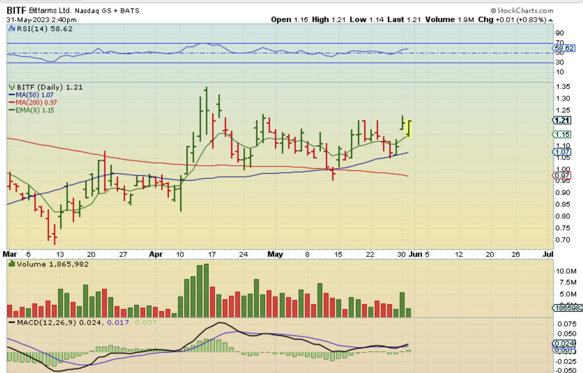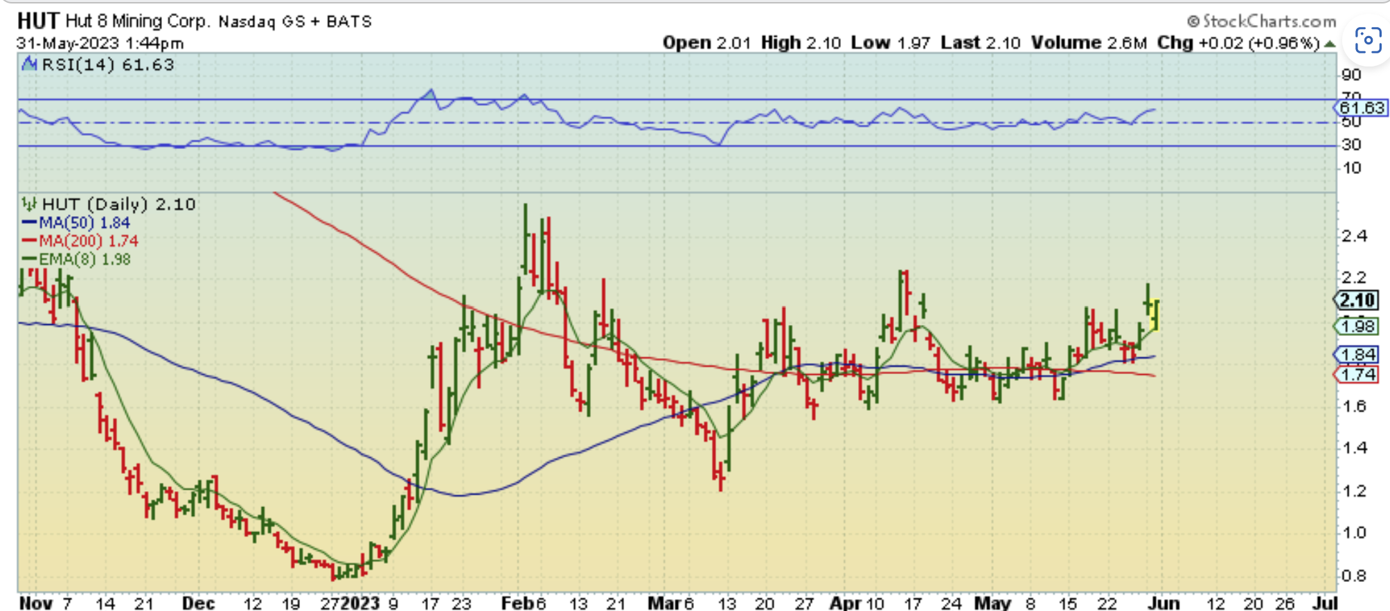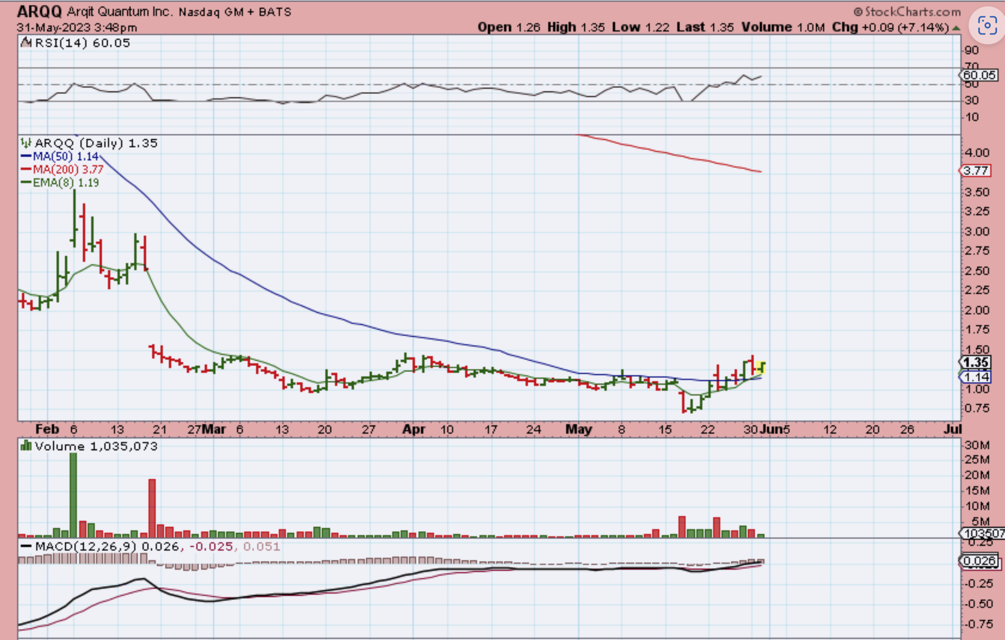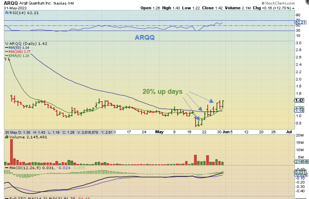 ARQQ – Each arrow points to an up day that was roughly a 20% pop. yesterdays was a 12% pop. This is choppy with up days and down, but now that it is over the 50sma, I think that it may begin to trend higher. Earnings was released 10 days ago.