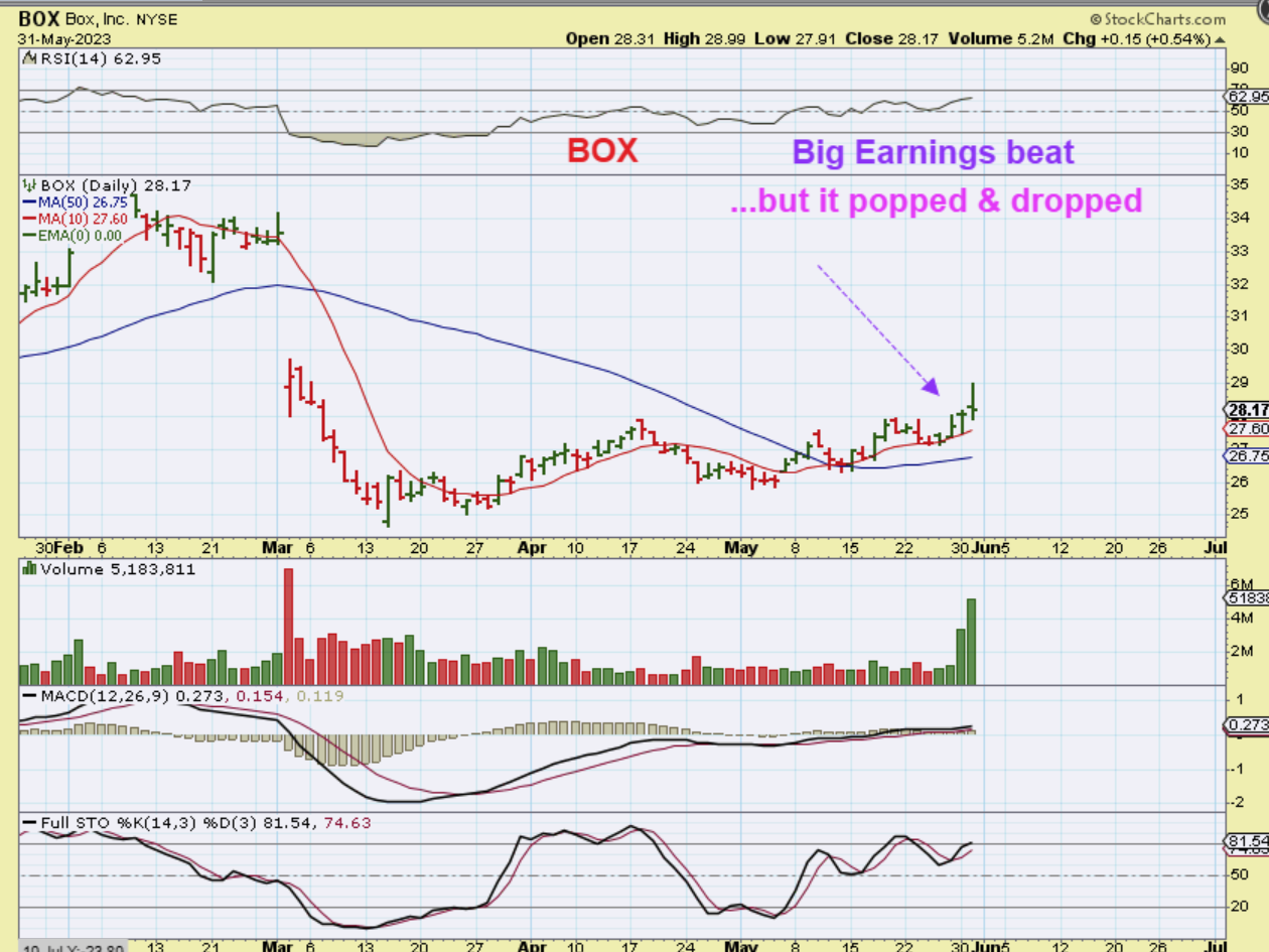 Yesterday BOX released earnings and it Beat estimates on earnings and revenue. It gapped open fairly big, but sold off as the day went on. I like this set up a lot and the volume a lot, I just don’t know why it sold off and stayed down, so I am putting this on my ‘watch closely’ watch list – to see if it stabilizes and starts to push higher again. Box was trading at $35, but ropped on March earnings to under $25. This report may help a recovery.