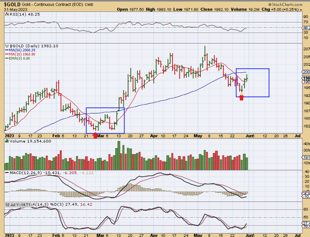 GOLD was higher, even though the USD was higher too. When we were supposed to be dropping into an ICL in February and March, we had a bounce that I expected to roll over to new lows, but the Banks failed and Gold then rallied. This may be a similar bounce, but this one should roll over (without the Bank failure rally).