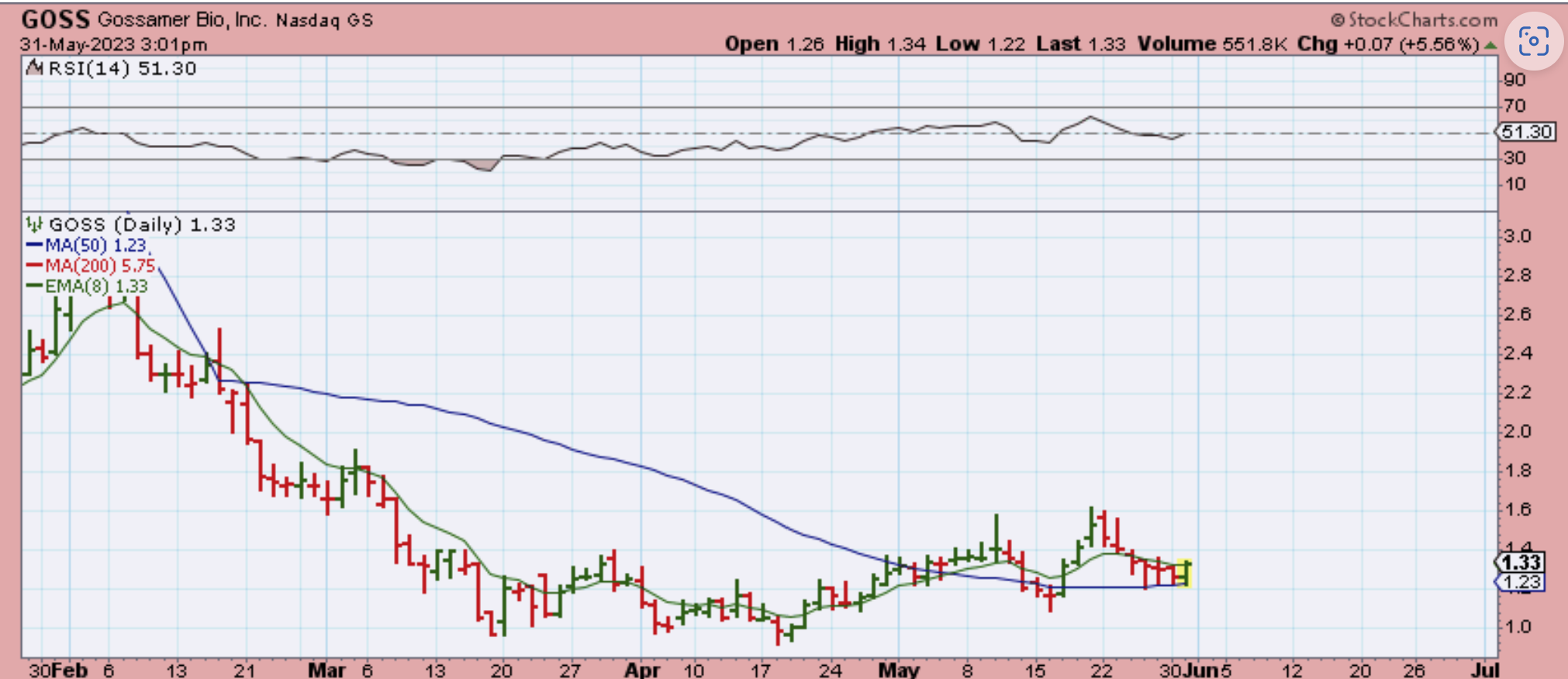I have had GOSS on my watchlist from April, and I like the current base. It is back at the 50sma and tagged it over the last 4 days and bounced. Since The General Markets may drop into a dcl, I have to wonder if this one could go back below the 50sma (?), but it was green yesterday with the markets lower. I am hesitant to buy it here, but I do like the base and will watch what it does if and when the markets continue to dip.