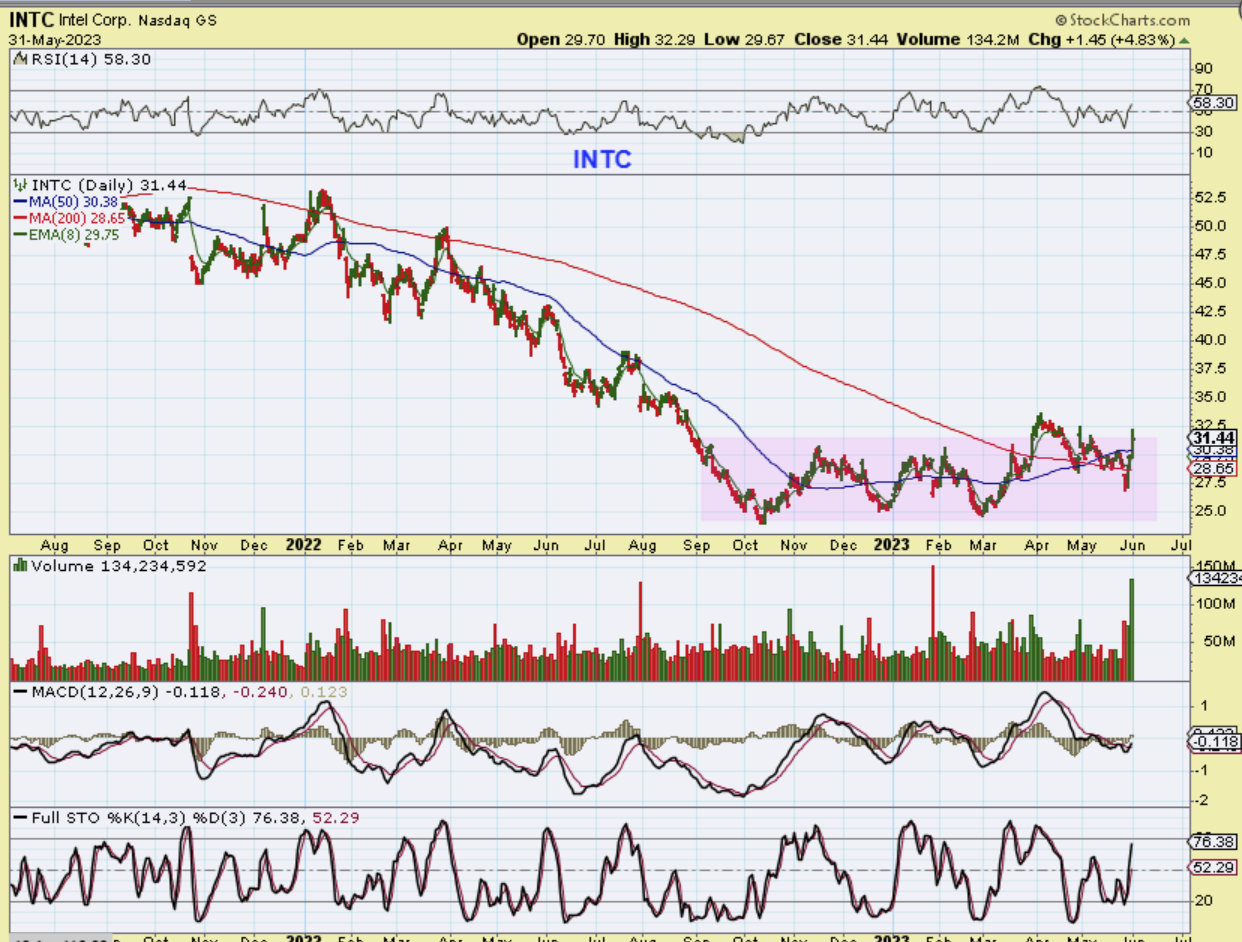 Ed, a trader in the commenting section, mentioned INTC as breaking higher, and when I took a look at it, it looks much like what I was going to discuss here, so let’s take a look.