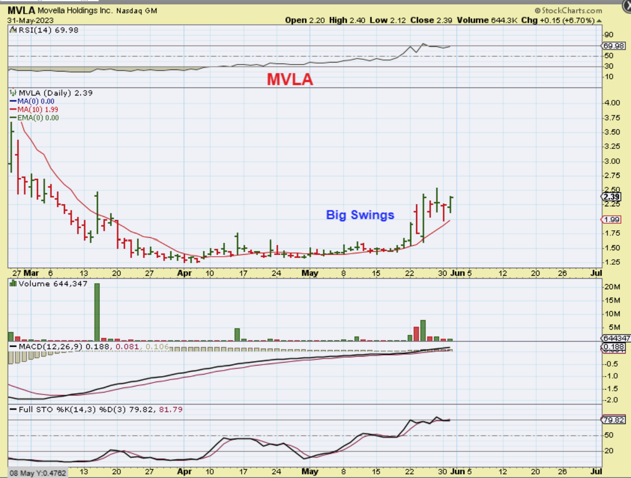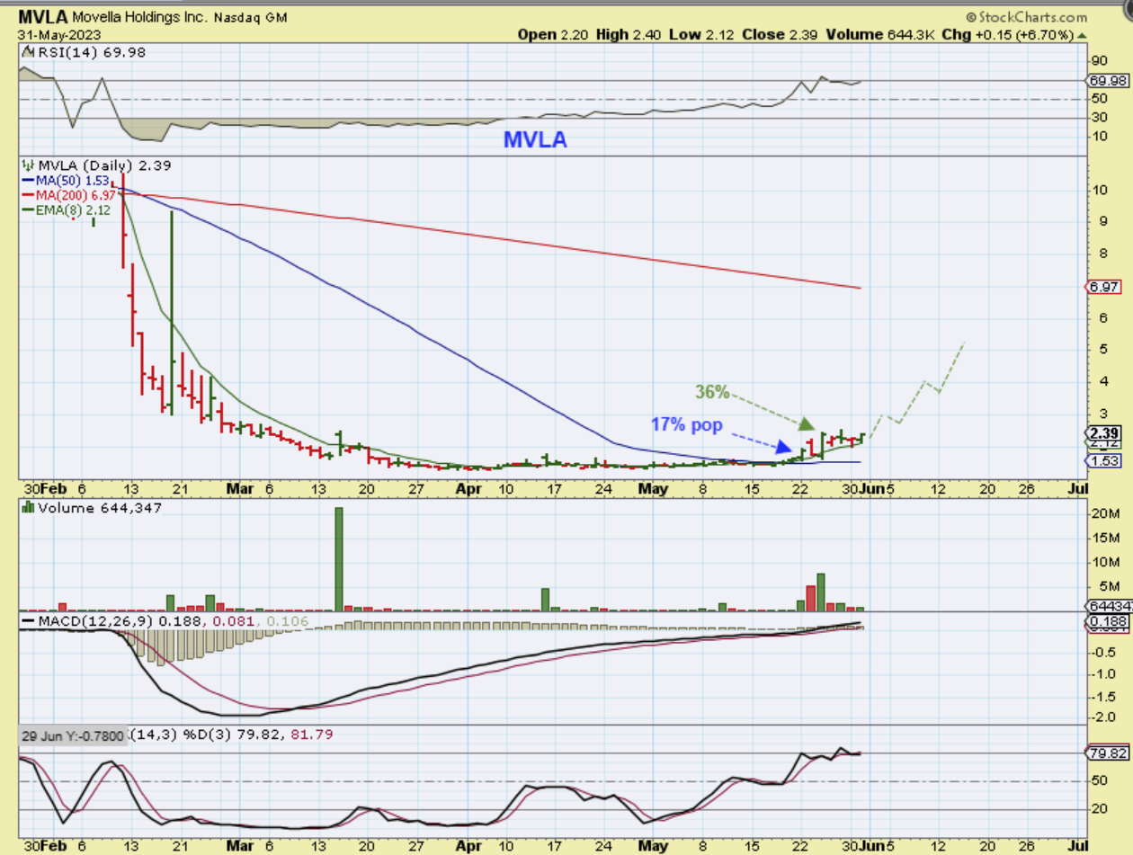 MVLA -had large 17% and 36% pops, but the down days can be fairly big too, so either wait for a dip and keep it on your watch list or start small on a down day and see how it goes. This can drop to $2 at the 10 sma.