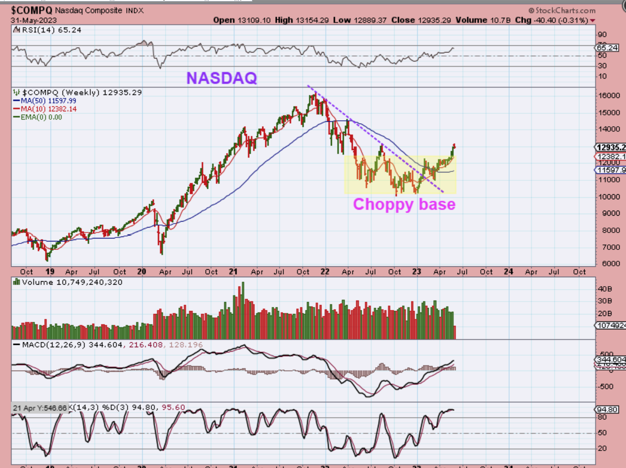 Yesterday I discussed how some companies are leading the way higher out of the Bear Market lows and are already near their former highs ( NVDA, AAPL, MSFT for example). Several of these ended up having small very choppy bases at the lows and then a nice run higher that followed.