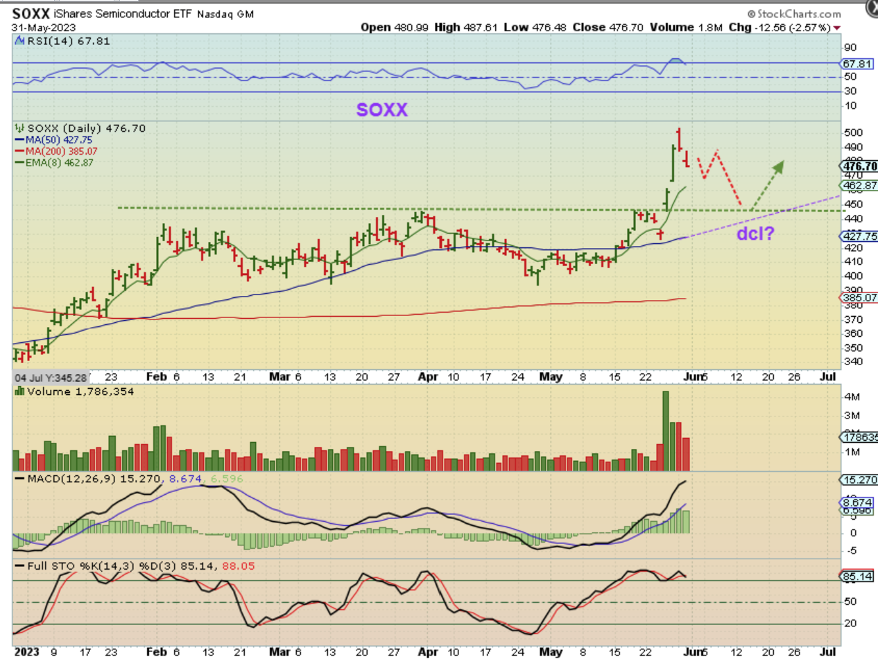 The General Markets will be coming due for a dip into a dcl soon, and that next dip may or may not be a deeper one. We might just drop to the 50sma again and then push higher, as shown here. This means that for now this reversal at the top may or may not be the ‘peak’ to this rally. I also want to keep in mind that this is the 3rd daily cycle, so buying the next dcl will need a stop that trails higher. I’ll discuss that more when the time comes.