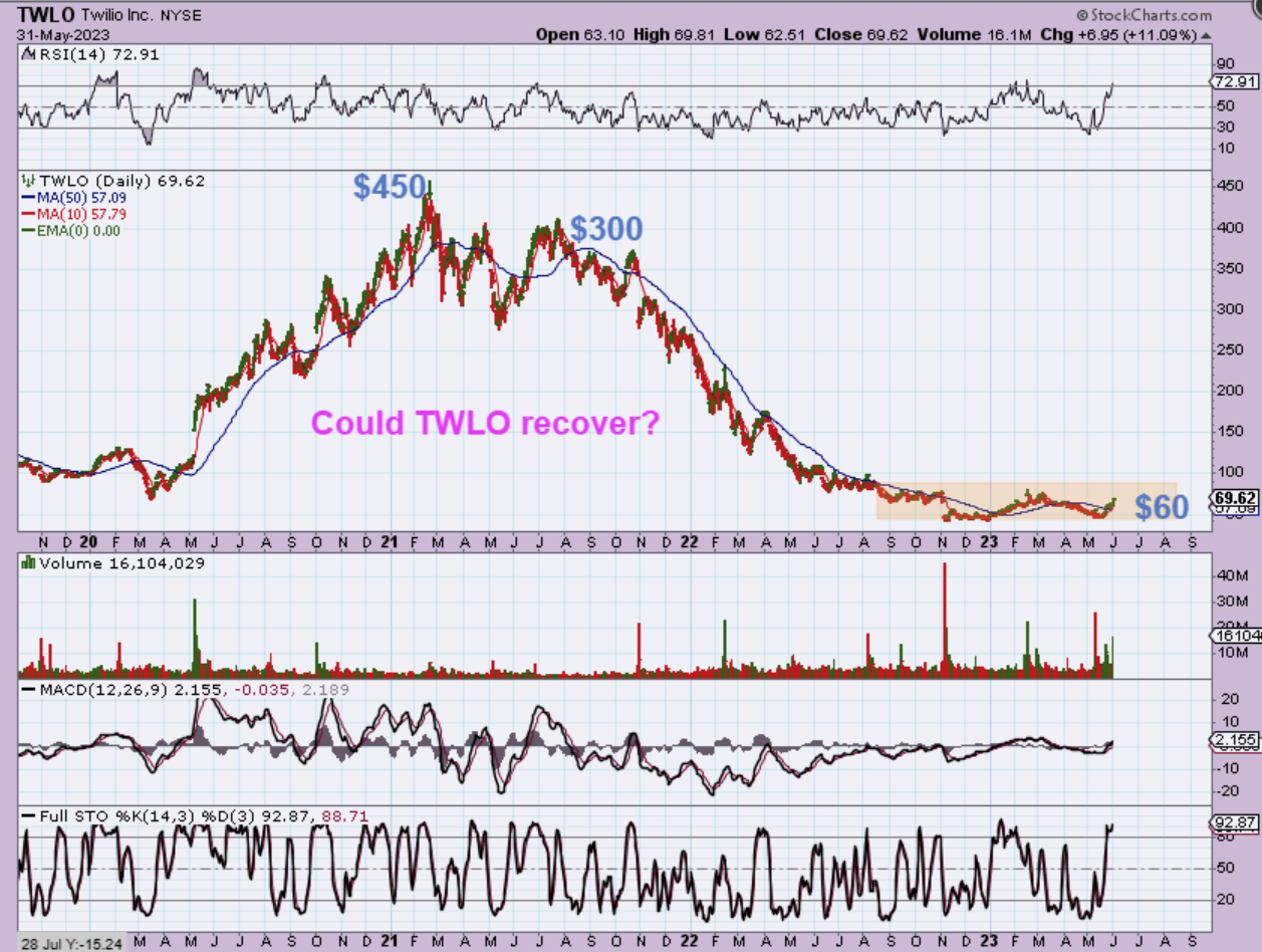 TWLO got crushed in that bear market correction. Notice that it ran from this area to $450 in 2020, but then sold off again to the $60 area. It is in a base moving roughly $60 to $70, but can you imagine if this recovers? I know that it doesn’t even really look like it is moving higher right now, but let’s zoom in for a different view…