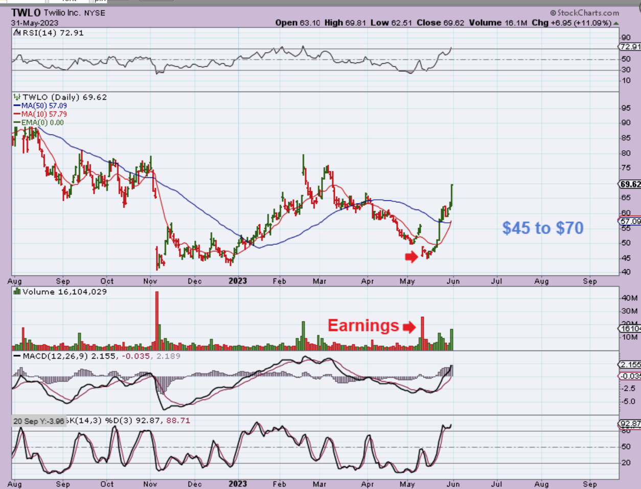 TWLO actually has moved from $45 to $70 (100%) in May alone, right after an earnings gap down. If we are close to dropping into a dcl, this is on my watch list to see if it becomes a buy at the 50sma with the next dcl. I tried to start a small starter position at the 50sma, but it never back tested it to trigger my buy (yet).