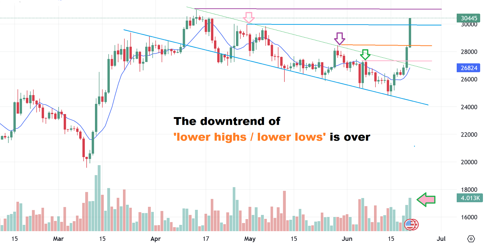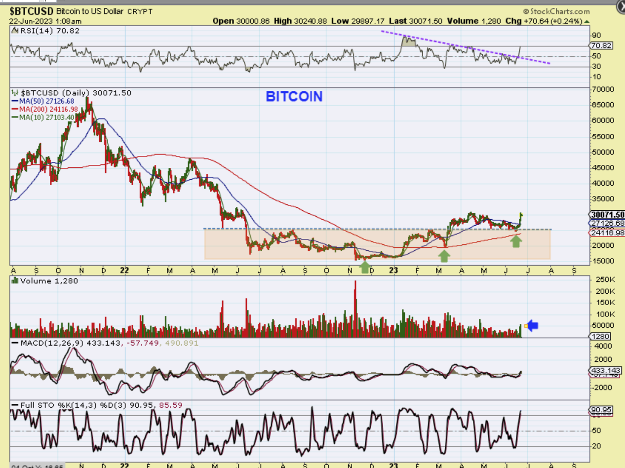 When I step back and look at Bitcoin I see a reversal just above the 200sma. I also see a break of the RSI above 50%.