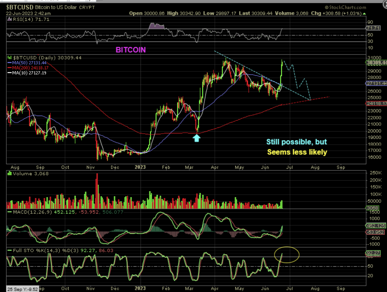 I was discussing the series of ‘lower lows and lower highs’ in BITCOIN, and that represents a downtrend. That down trending channel has definitely ended with this weeks surge in Crypto (especially Bitcoin, since some alt coins have not yet broken downtrends). I have also discussed trading or buying MARA, RIOT, CLSK, HUT, HIVE, etc etc as short term trades or buy and hold.