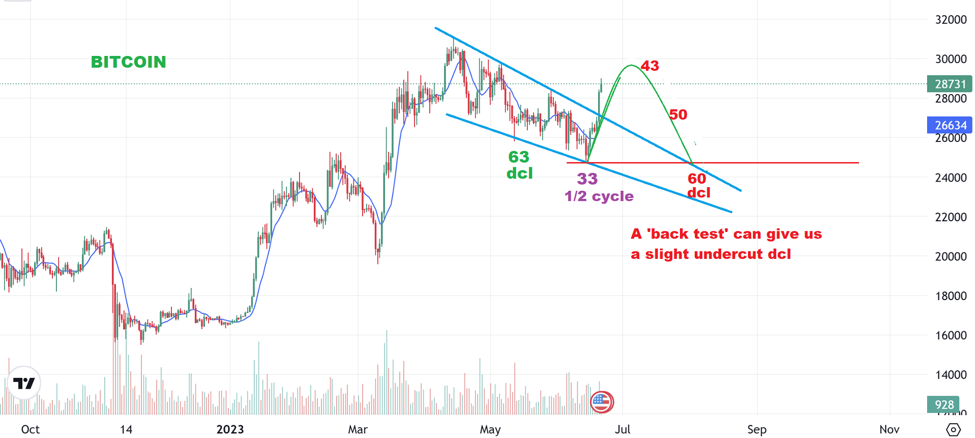 BITCOIN – I drew this yesterday simply to point out that we could rally and roll over to back test the downtrend. This is not a guarantee, we could just rally to $35,000, but it does fit one cycle pattern of 30 & 60 daywaves, so I put it out there as a cautionary note (something to watch for going forward).