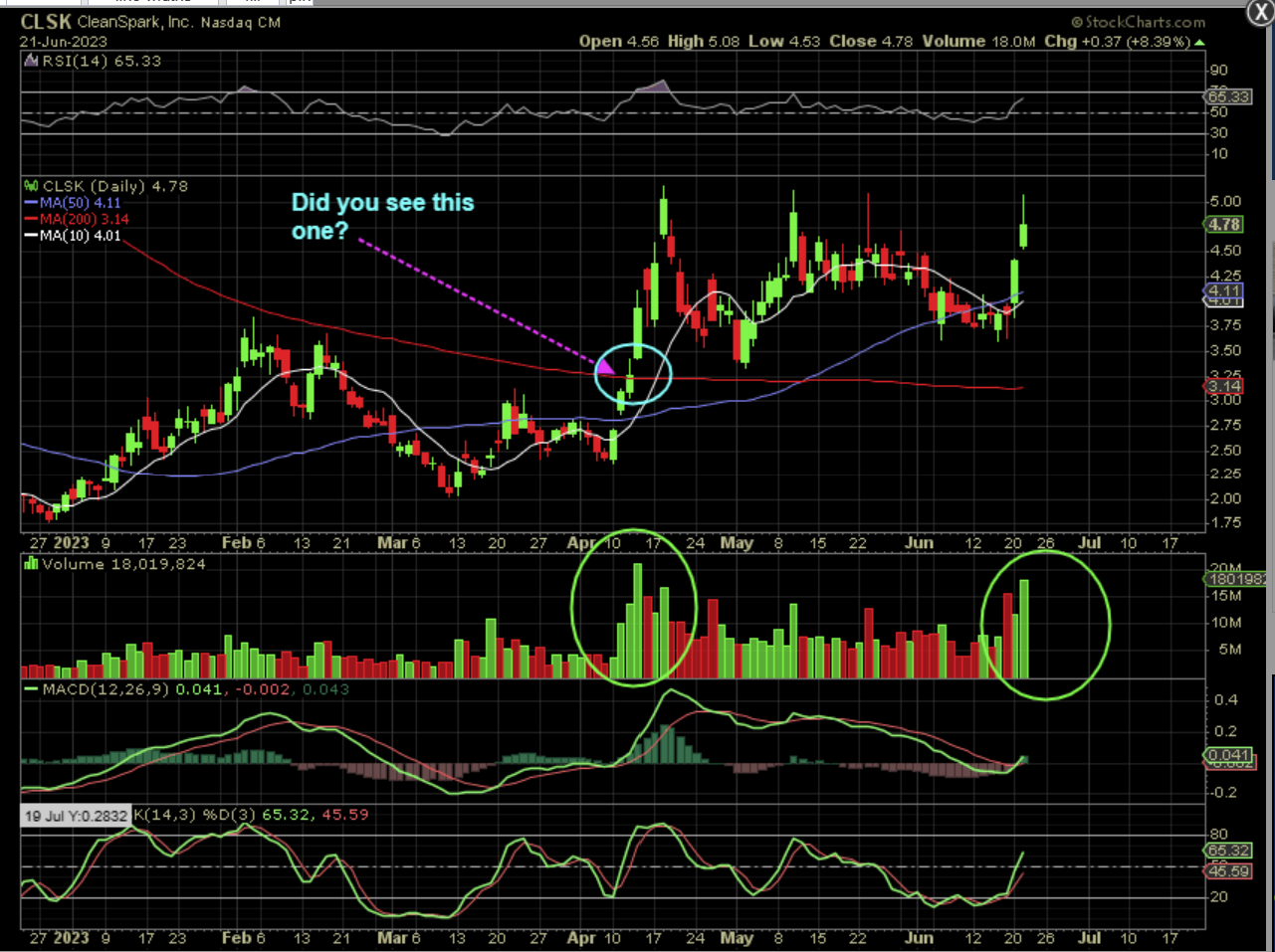 CLSK – That being said, I am also pointing out one of those candles that formed at the 200sma in April. It was NOT a top or pause at all, so we can continue higher, I’m just pointing out that the odds favor a stall when I see those.