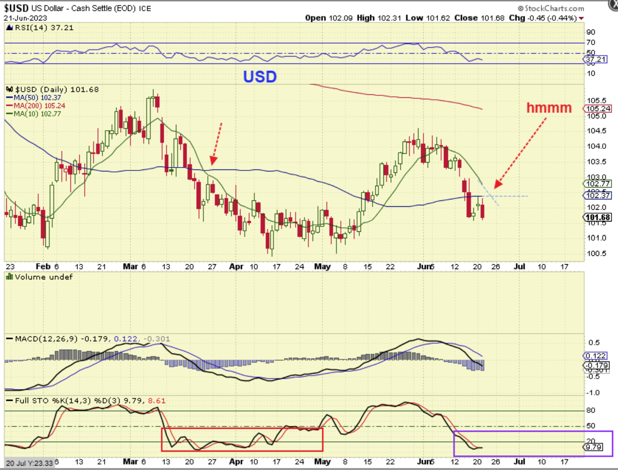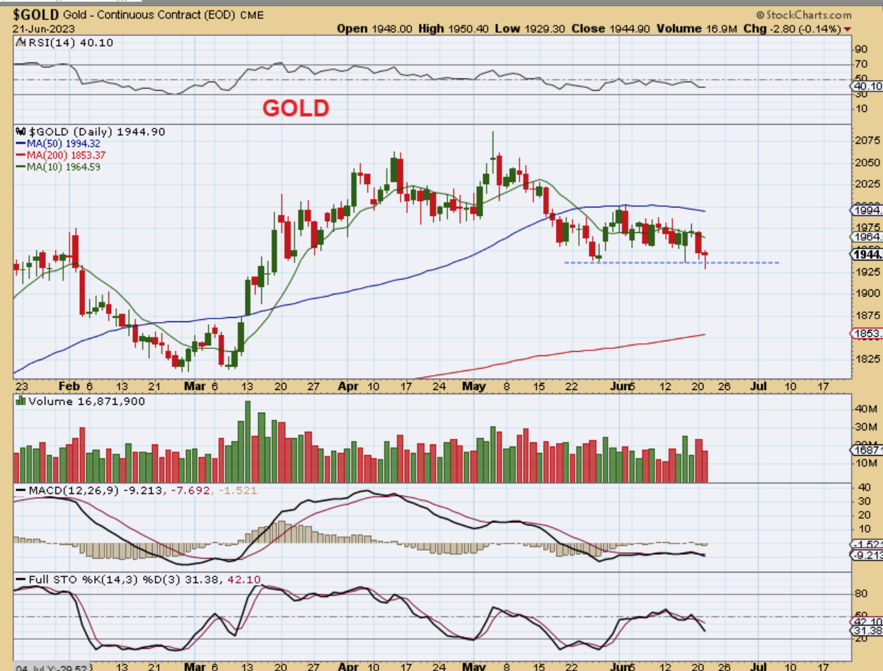 THE USD actually moved up to that 5o sma and then dropped. The USD was rejected. Is this sell off going to continue lower like we saw in March? Gold rallied when that happened (Banks failed in March), so let’s look at Gold. Did it Pop?
