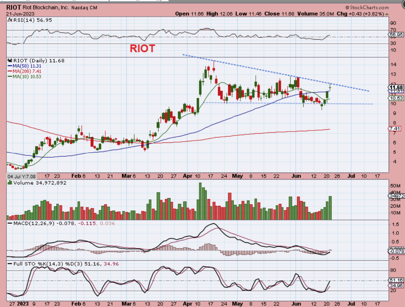 RIOT is at a downtrend line, and it put in a doji, so we did see various possible topping candles or pausing candles. RIOT just pushed above the 50sma, so that can be used as a stop if the sideways chop continues. If you bought RIOT near $10, you could lighten up and watch for a breakout or pullback to re-add. The sideways chop of RIOT may continue here for a bit unless Bitcoin keeps running. You can also just BUY & HOLD this consolidation if you are long term bullish.