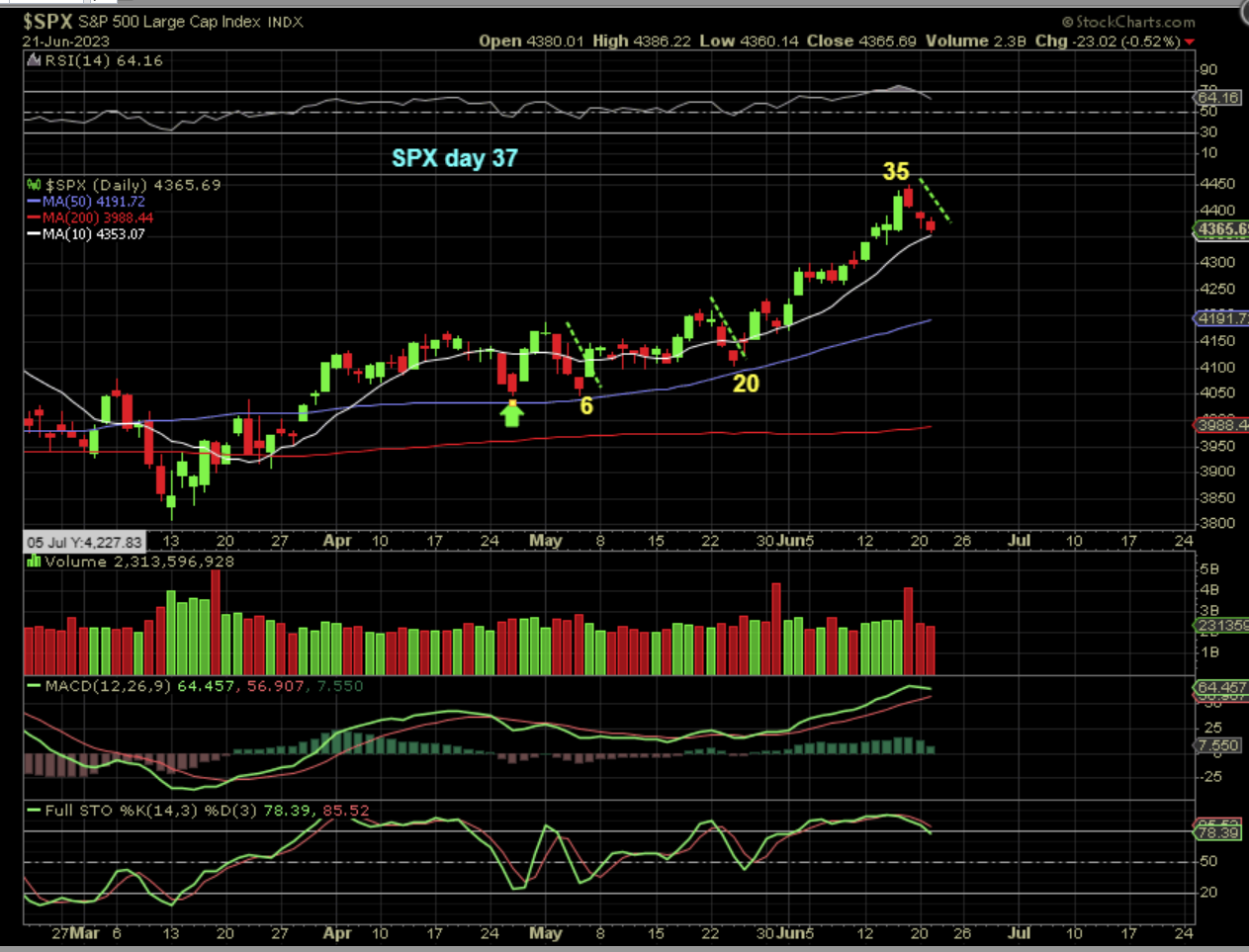 Yesterdays chart of SPX mentioned that on day 36, we are due for a dcl at any time. We did have this reversal candle on Tuesday, so the question was, “Could Bulls push it higher?”