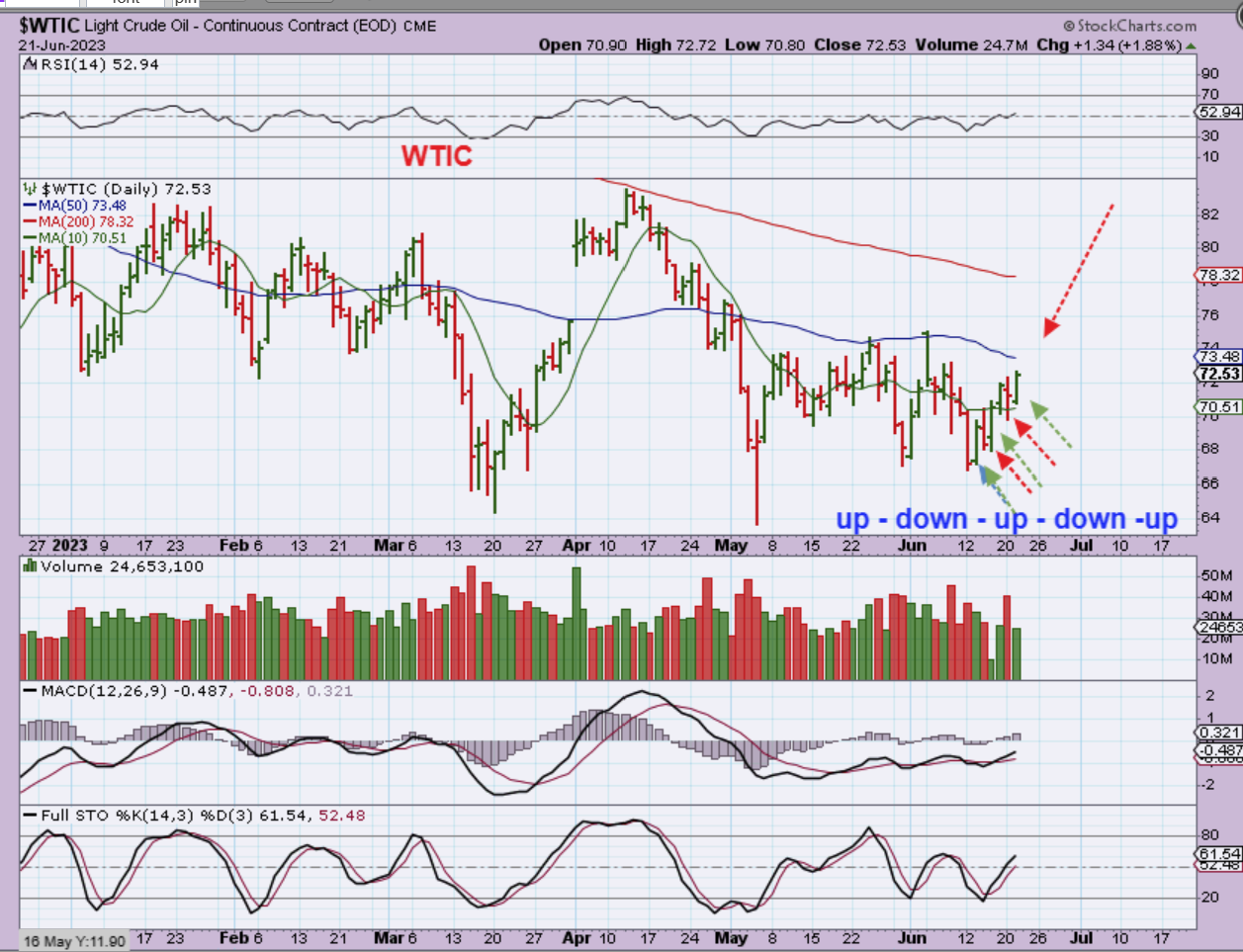 WTIC – Oil is choppy. Each day it goes Up, then down, then up, down, up. What will it do when it gets to the downward sloping 50sma? It is due to go down.