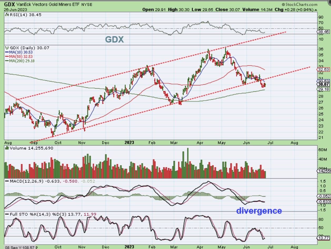 GDX is interesting here too. It slightly breaks that lower trend line and bounces. It is there now. I also currently do see good divergence with the MACD and price at new lows. That usually calls for a good bounce. This actually looks ready to bounce higher. If I was holding JDST as a hedge, I think I’d close it for now, until I see what this wants to do.