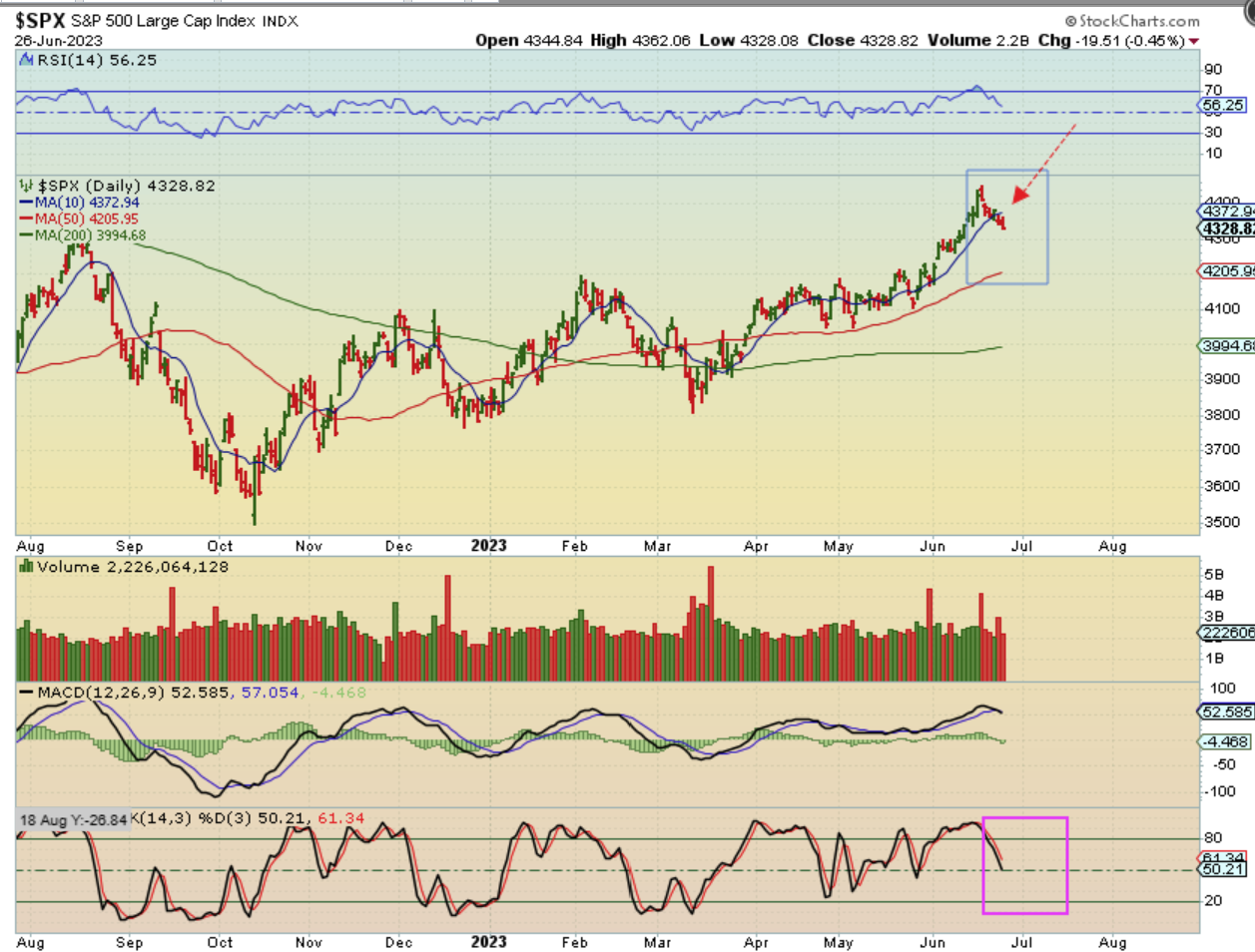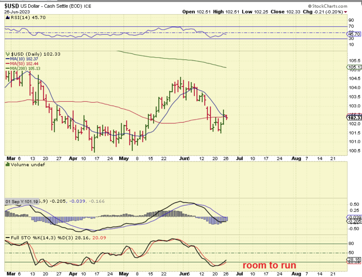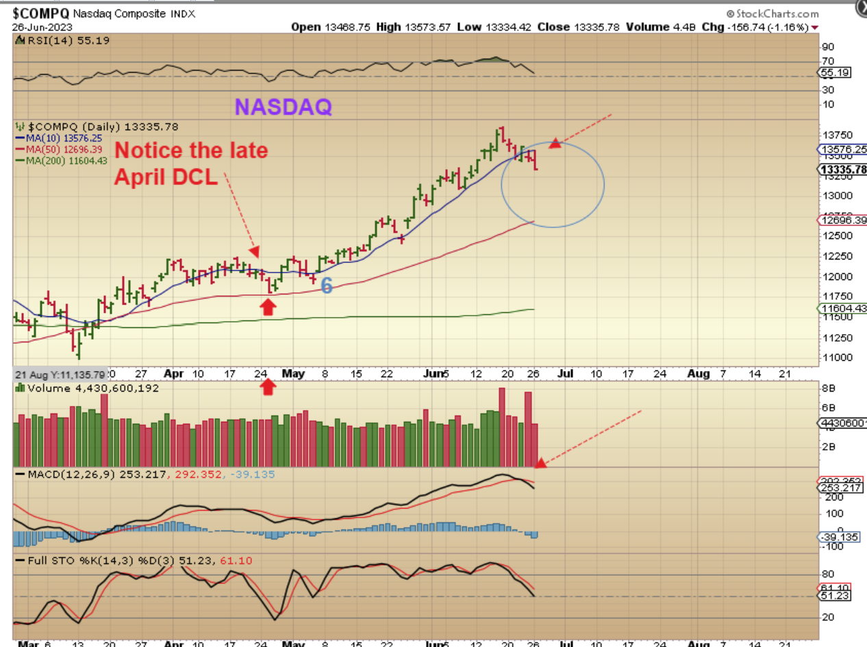 THE NASDAQ put in a DCL in late April, and was due to dip into the next dcl, so we discussed that with the reversal at the highs. Losing the 10sma on Friday was a sign that we might be starting that drop, and now we can see that selling picking up a bit. I actually did go short near the top, but that reversal at the 10sma had me close my short position. I may go short again for part 2 of this drop ( I should have shorted on Monday, but unfortunately, I was not ‘focused’ on trading after the morning eye exam that I had).