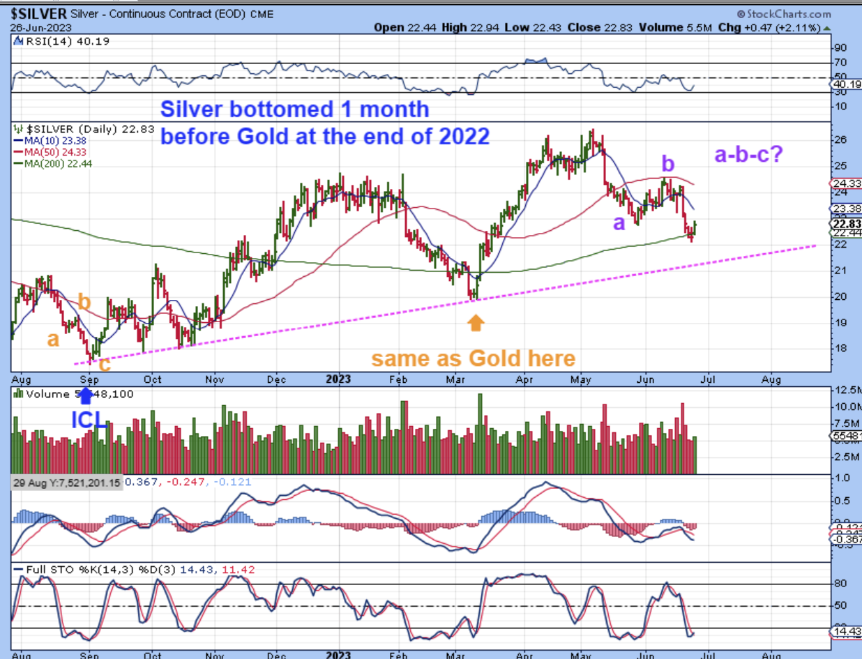 Now SILVER is interesting because on a few occasions, it has bottomed ahead of Gold. Last year, when Golds ICL was in Oct 2022, Silver bottomed at the end of August, first day of September. It did that a-b-c drop into the ICL, as seen here into September. We do have a similar set up now, but …