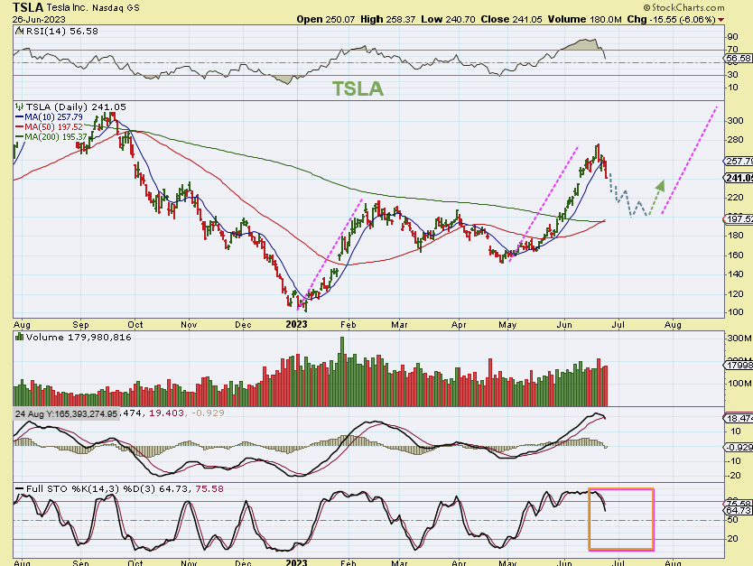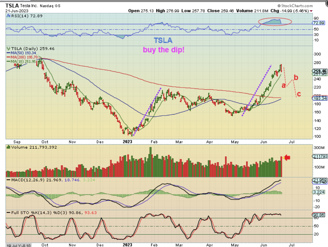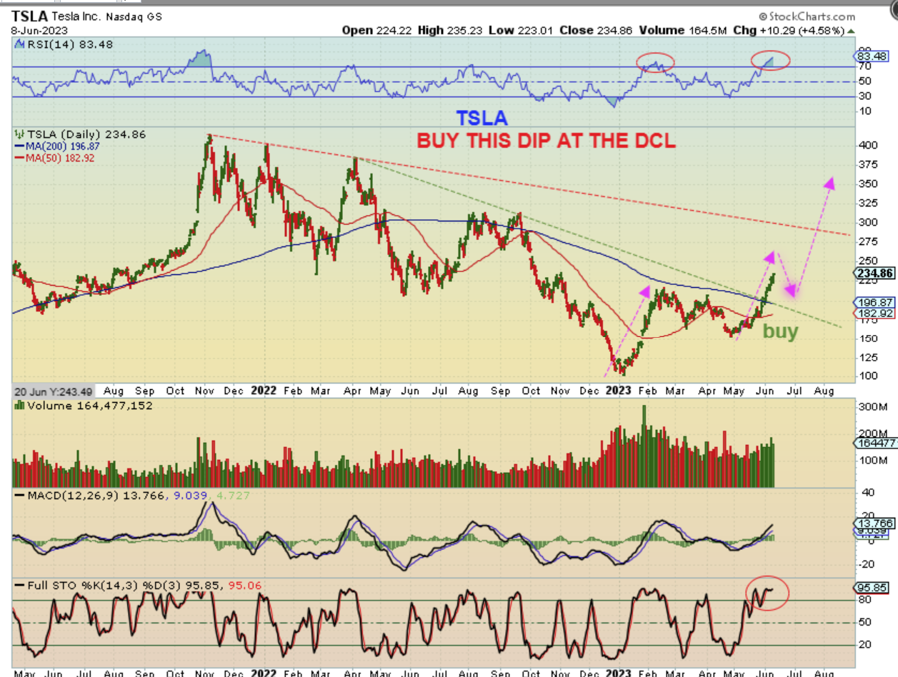 TSLA #1 – It was a buy at the last choppy dip under the 200sma or as it crossed the 200sma. I drew this on June 9th to show that this run should top and then the next dip would be a buy too.
