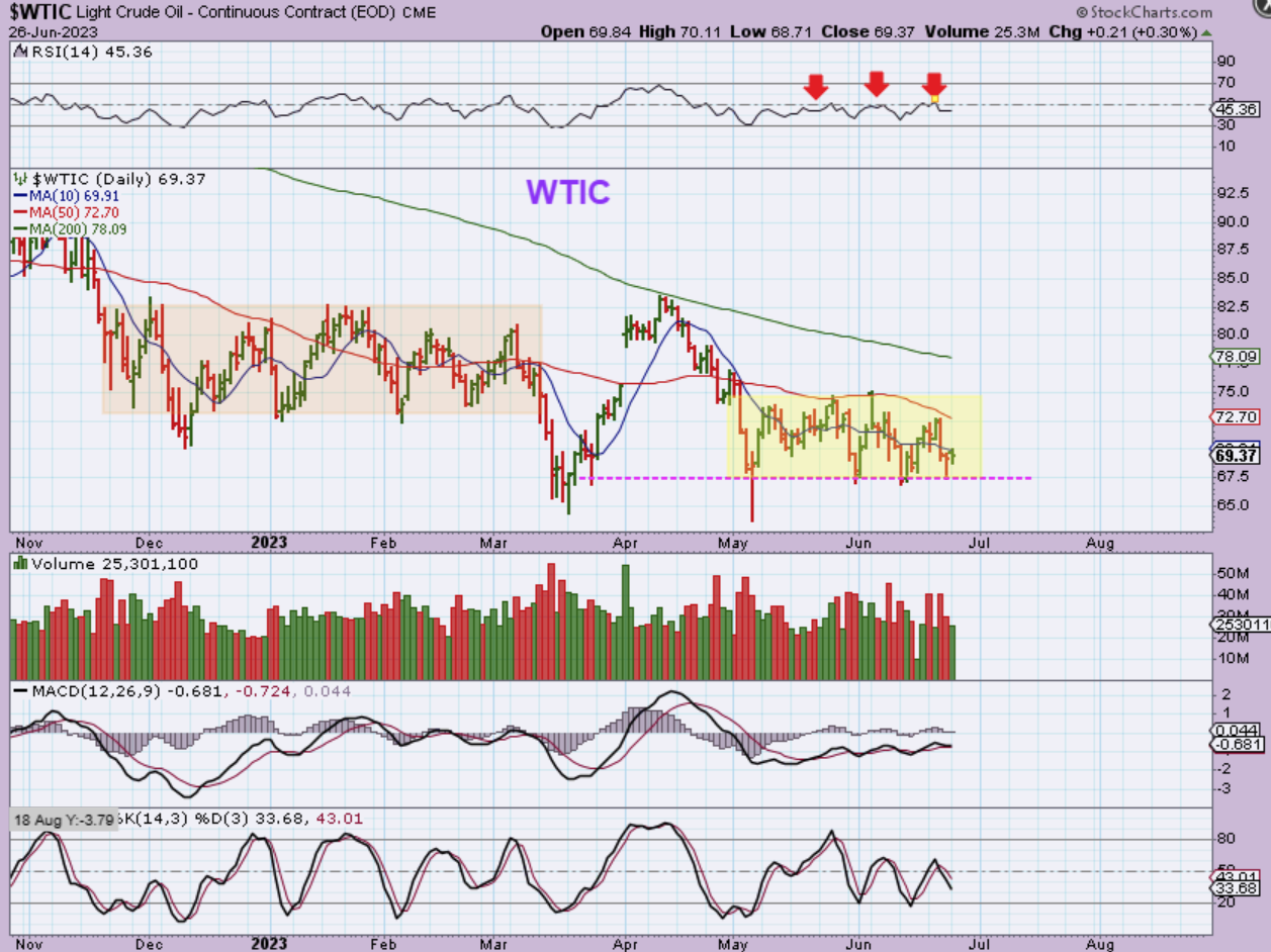 Oil has been very choppy and it is currently pinched between the 50sma and the lower support line.