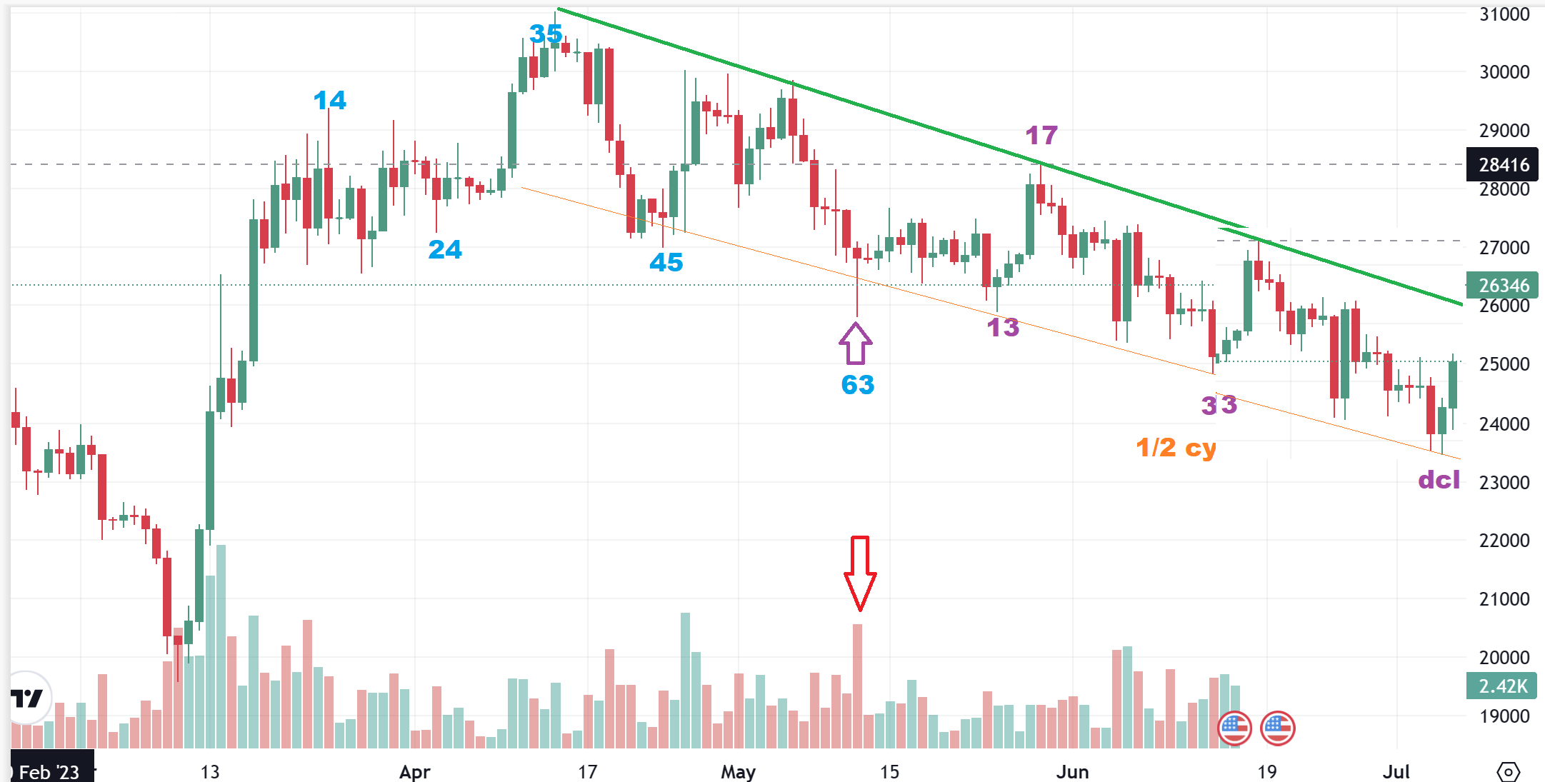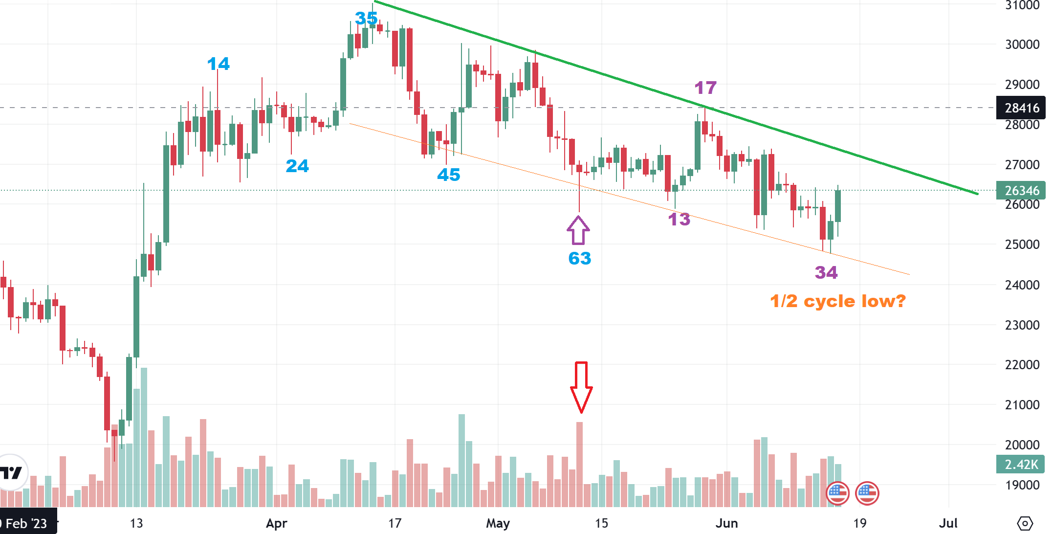 BITCOIN – We got a pop last week on Bitcoin, but I have pointed out that a downtrend in play and I think we just saw a 1/2 cycle low and not a dcl. I have mentioned 30 day and 60 day dips in Bitcoin as being fairly reliable, so I have placed the count here for you to follow where I think we could be.