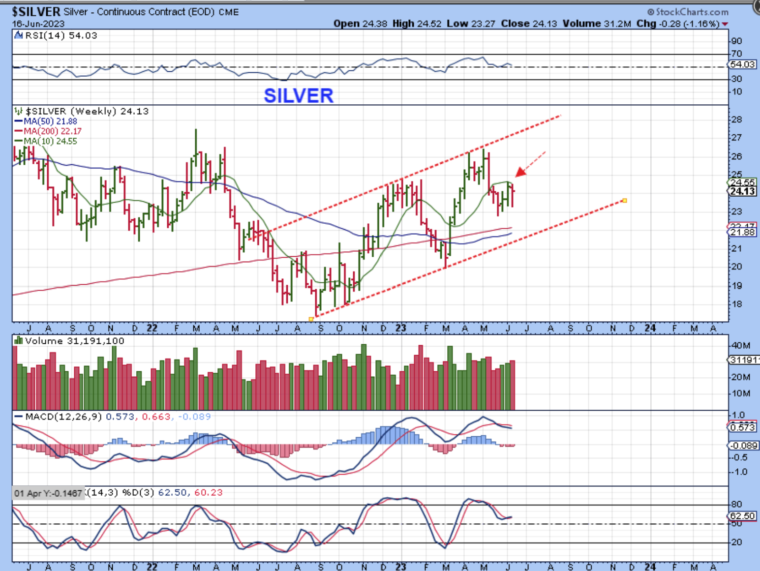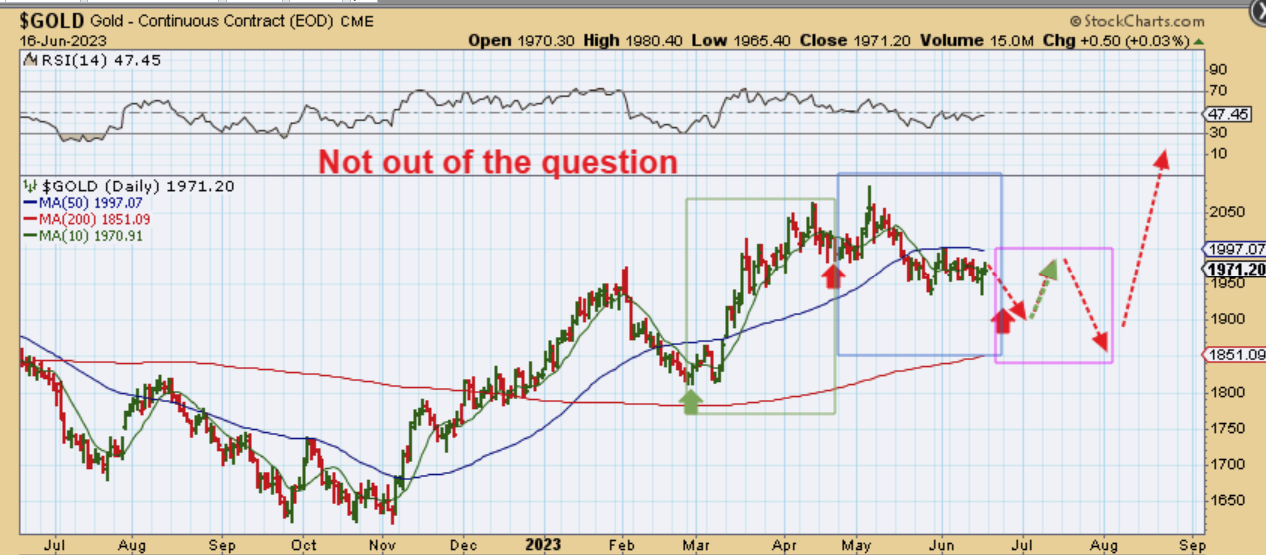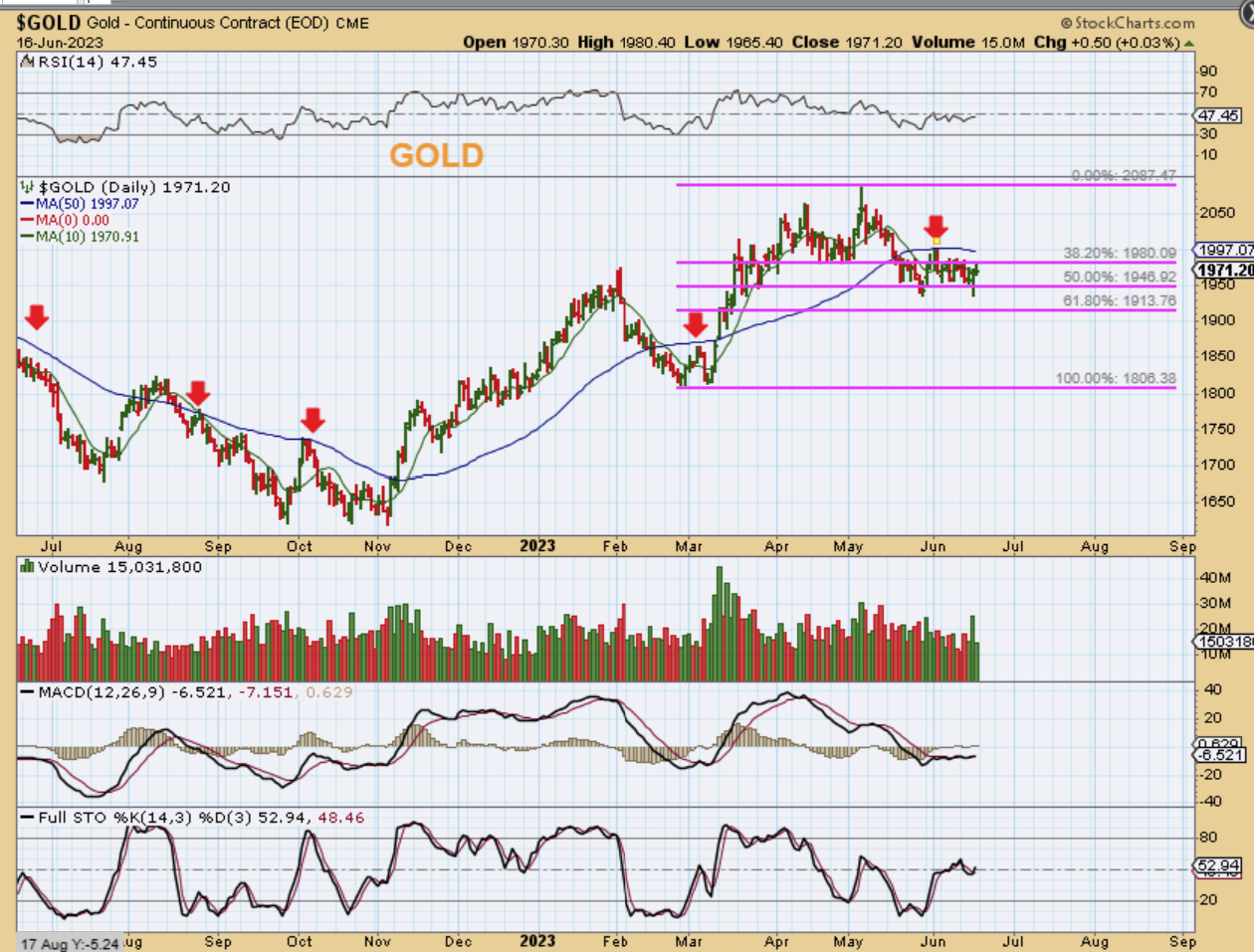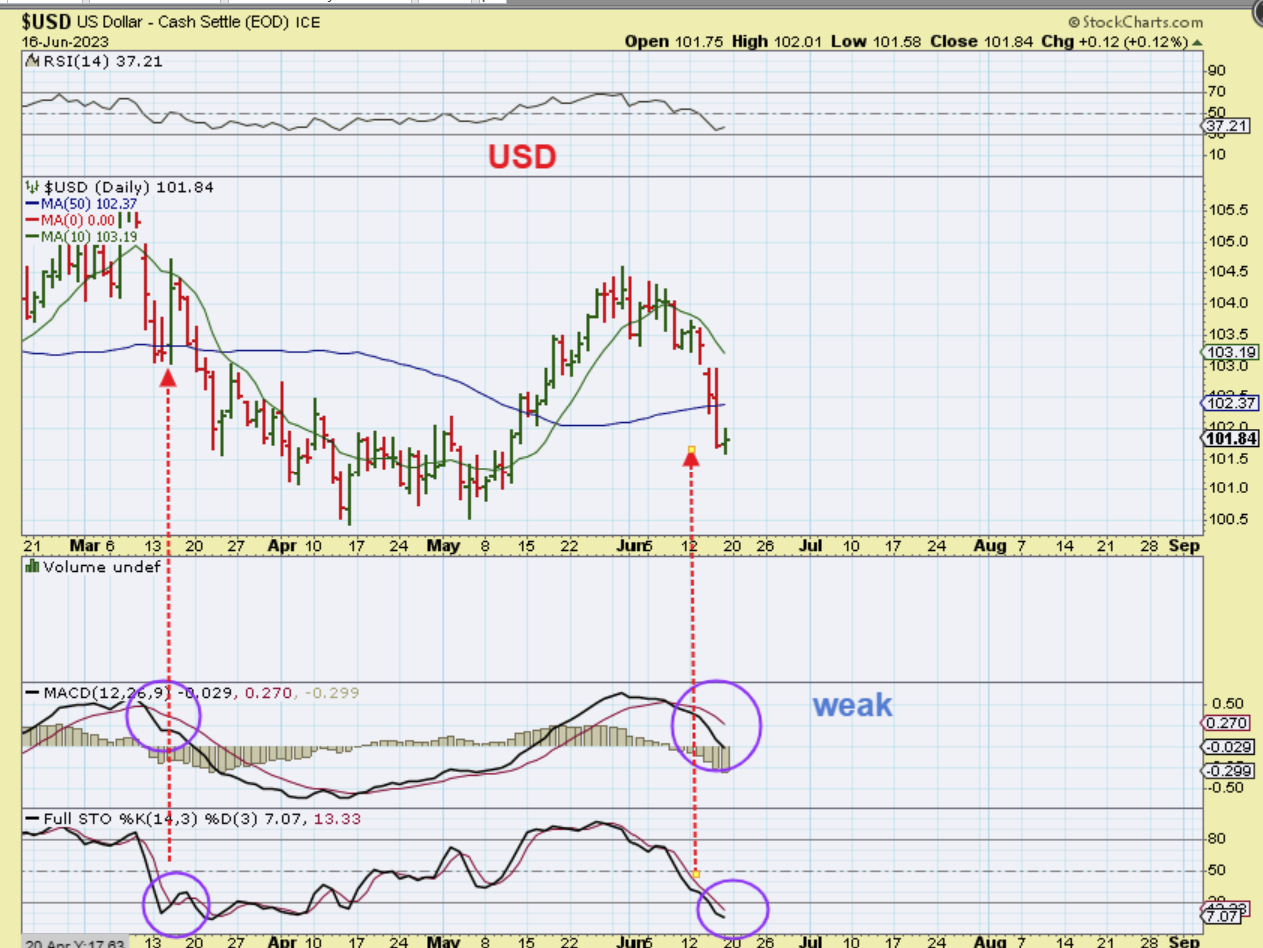 THE USD was rallying relentlessly in May, but it is now starting to lose its strength. It sliced through the 50sma. Will it out in dcl, or bounce and continue to drop? In March it had a 1 day VERY STRONG ‘up day’ (red arrow), all the way to the 10sma. That looked very strong, but then it just rolled over. At that time: