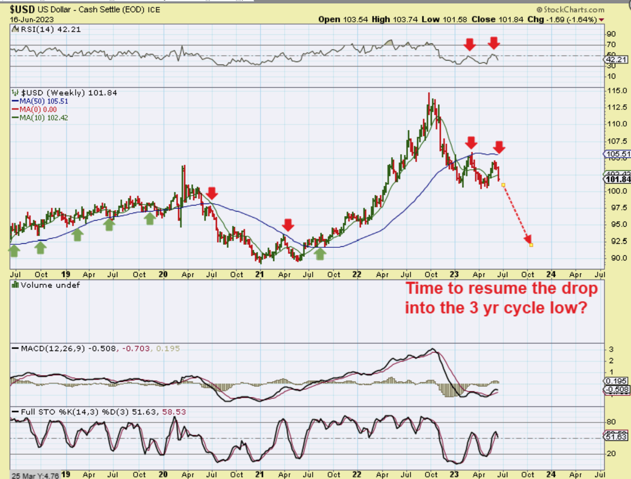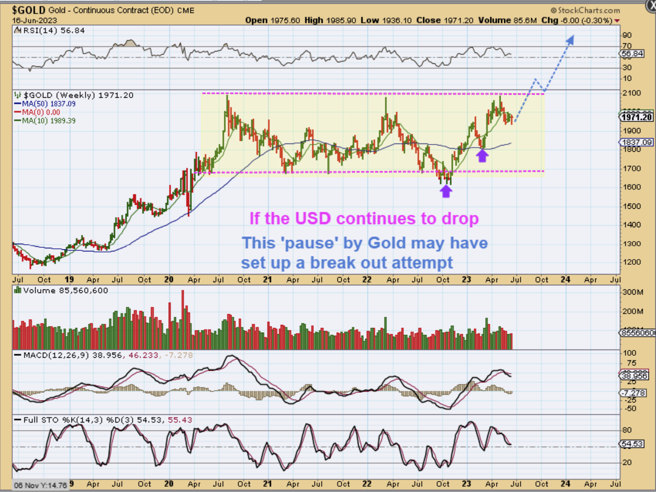 THE USD WEEKLY CHART actually looks very similar to the Feb March rally too. The blue line is resistance if the USD bounces. At the very least, this is showing us that no matter how strong the USD looked during that Feb or May rally, it can fall just as quickly. So the USD dropped last week, and…