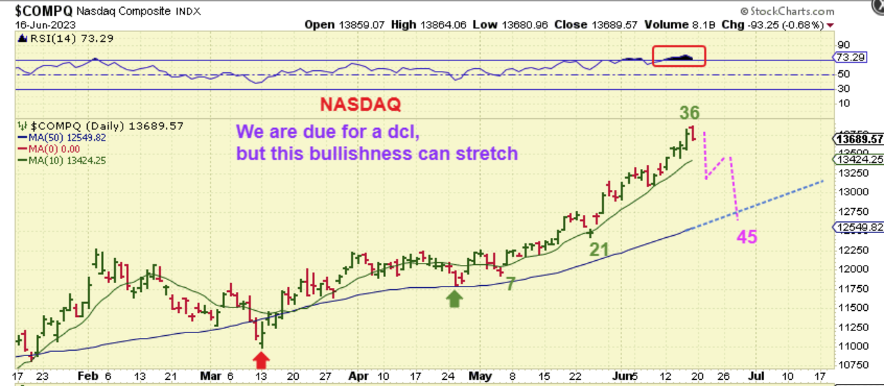 THE NASDAQ Daily shows us as being on day 36 with a pop and sell down on Friday. It was a strong week and it has been a good run out of the March lows. It is possible that this is the ‘peak’ of this daily cycle, because a normal daily cycle last around 40 days give or take, however some may just continue to raise stops at the 10sma support, because……