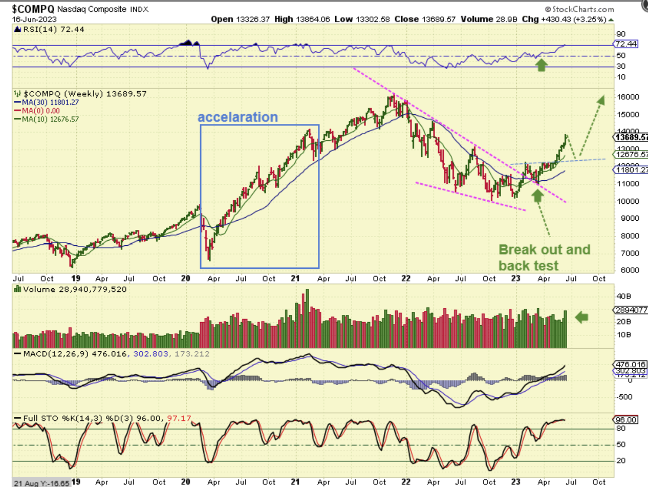 NASDAQ WEEKLY – In recent reports, I was pointing out the way that the NASDAQ accelerated in 2020 out of the lows. Notice that the pull backs became more shallow on that run. Currently, I can see a breakout from recent choppy consolidation, and I do see a bit of an acceleration starting, and that is why I pointed that out. Our markets may rally back to 2021 highs over time.