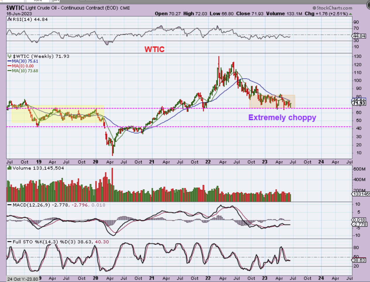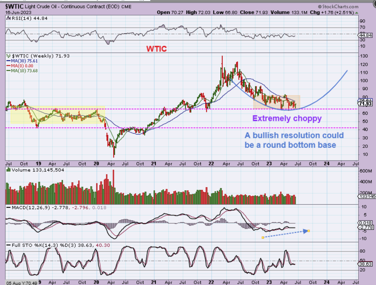 WTIC – Oil has been very choppy as it crawls along a possible support area. oil stocks have been a little more bullish than Oil, however Oil MIGHT base here and then rally, because…