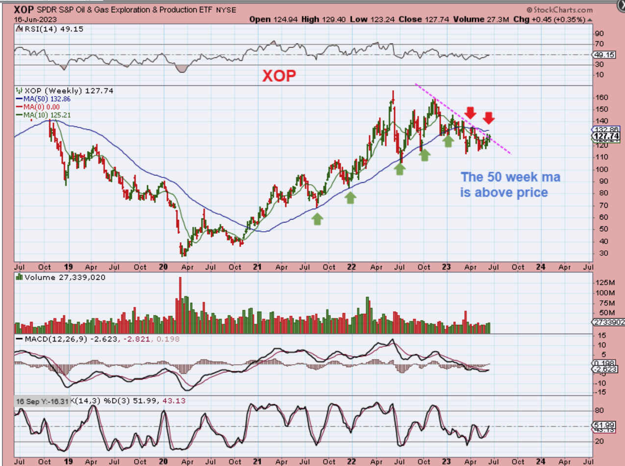 THE XOP is crawling along under resistance levels, but a break of the downtrend line or 50 week ma should lead to a bullish upside move. For now- Oil and Oil stocks have been frustrating and choppy, but that may change with this pattern setting up.