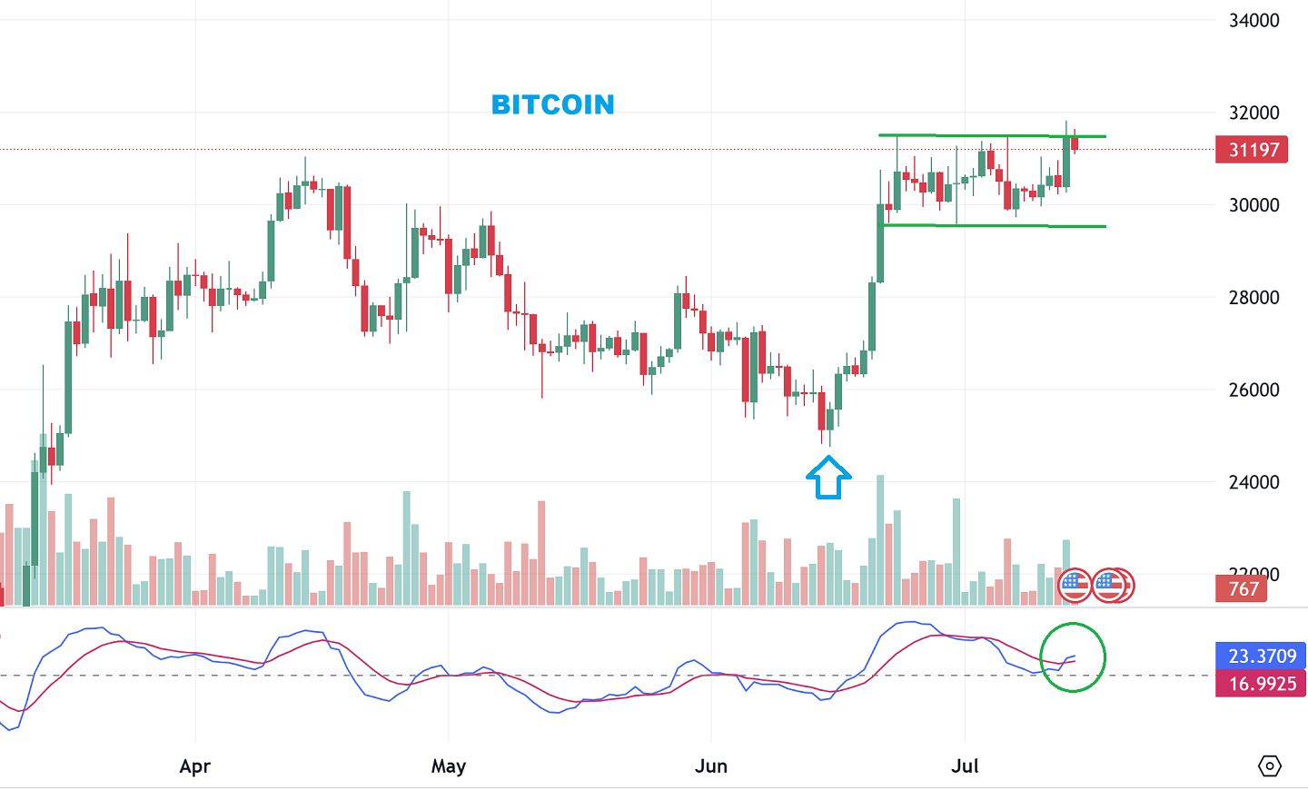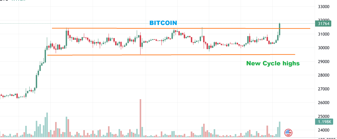 BITCOIN has dipped back under the breakout overnight. Was that just a ‘news driven’ false break out that will give us a dip as we near day 30?  Or will this just pause & then continue higher for the next couple of weeks (giving us the 60 day cycle).  I have expected a run to the $35,000-$36,000 area the whole time, so either way I still am going to expect another run higher.