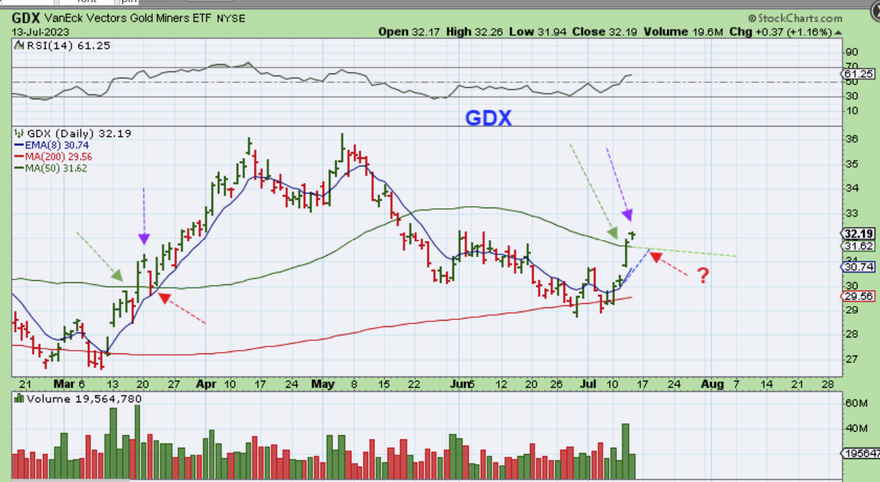 GDX stalled like Gold after breaking above the 50sma. I mentioned yesterday that this could happen by pointing to the break out in March. We saw a 3 day pause then with a Break through the 50sma, a Doji, and then a drop that actually went back under the 50sma. It landed on the 8 ema, so …
